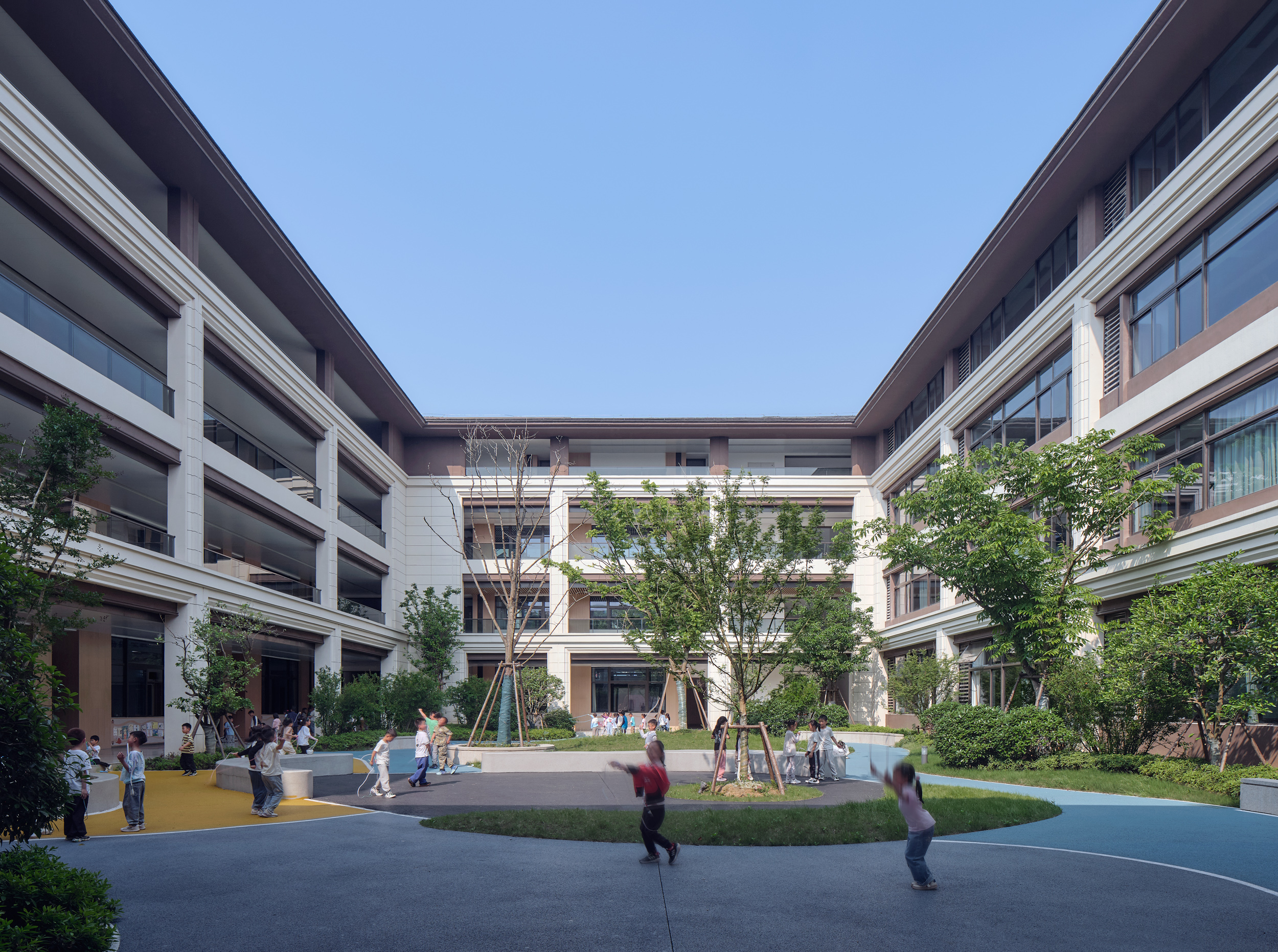 项目利用场地高差,因地制宜地将地形劣势转化校园布局的特点,形成一所园林式的学校,将现代的造景手法和具有传统韵味的庭园空间相结合,构建出一片可学、可游、可赏的健康生态学园。