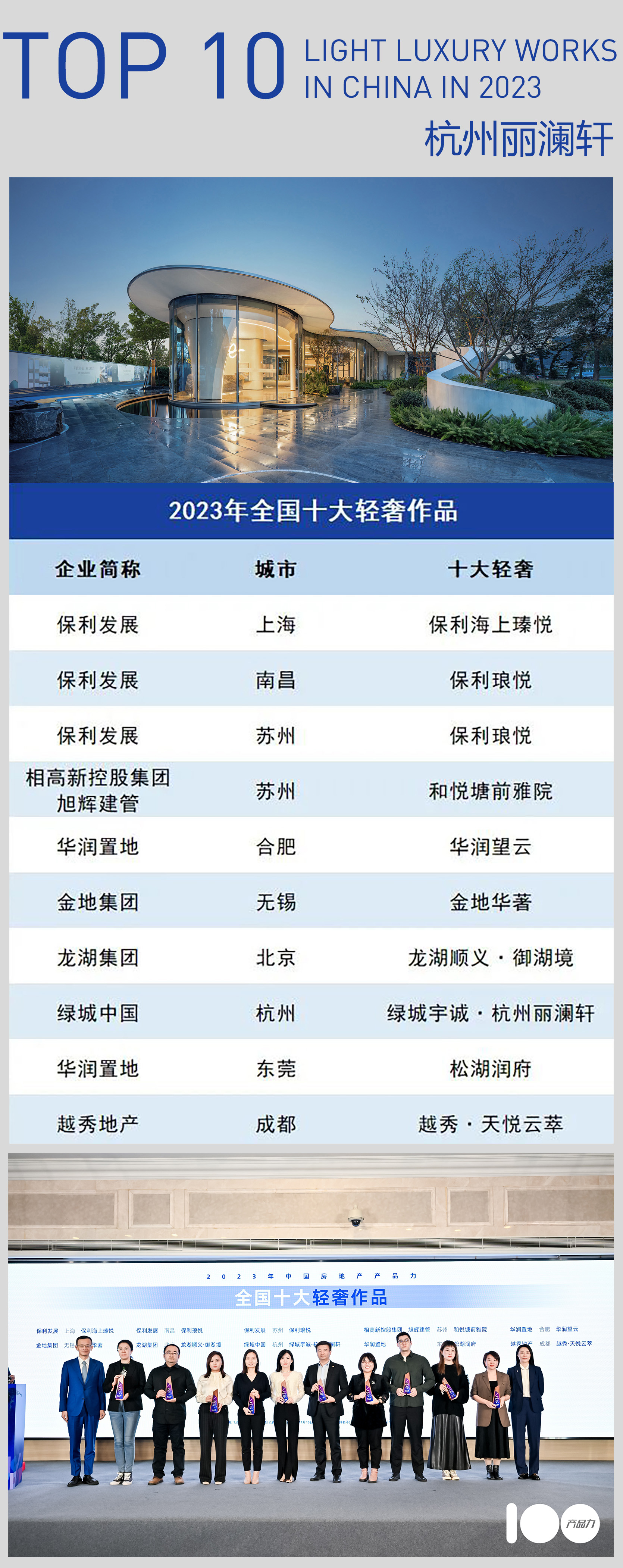 11月28日,克尔瑞产品测评公布了“2023中国房地产企业产品力排行榜TOP100榜单”,九米设计的绿城宇城·杭州丽澜轩获得“2023年全国十大轻奢作品”。