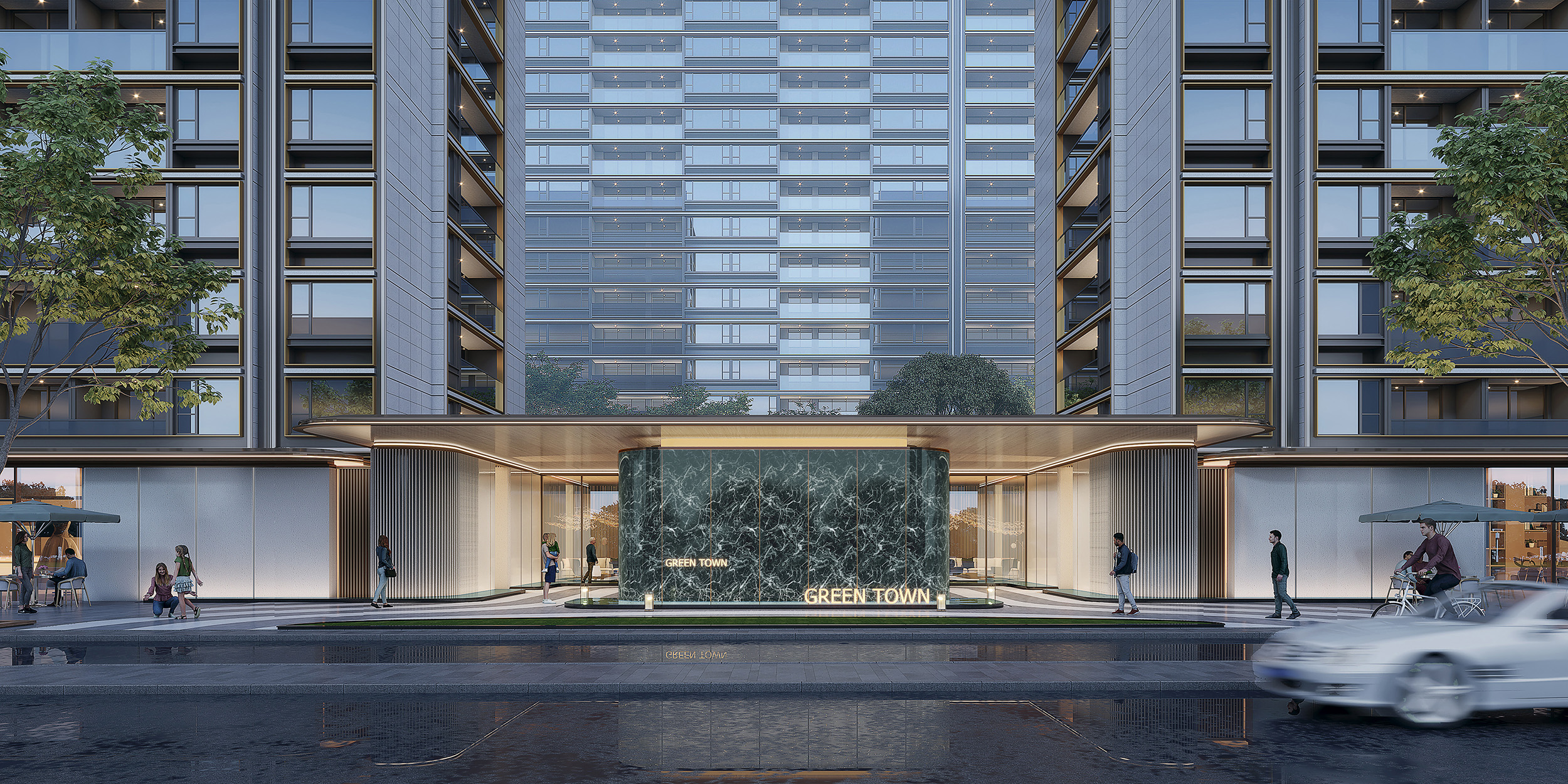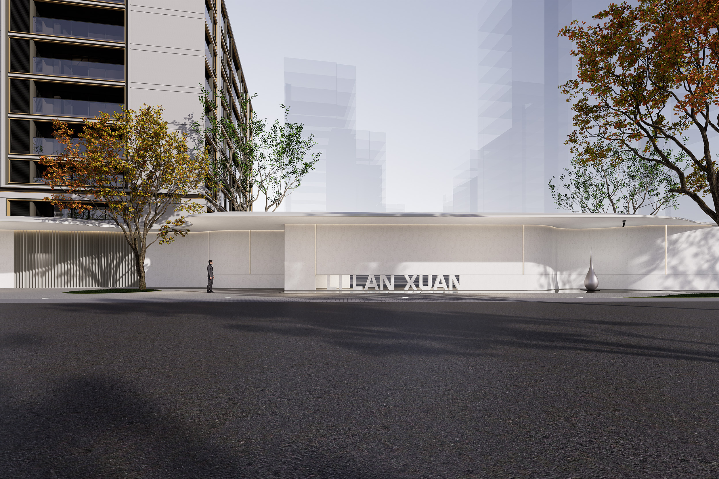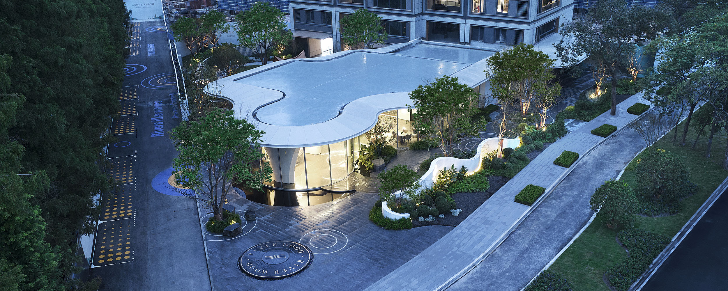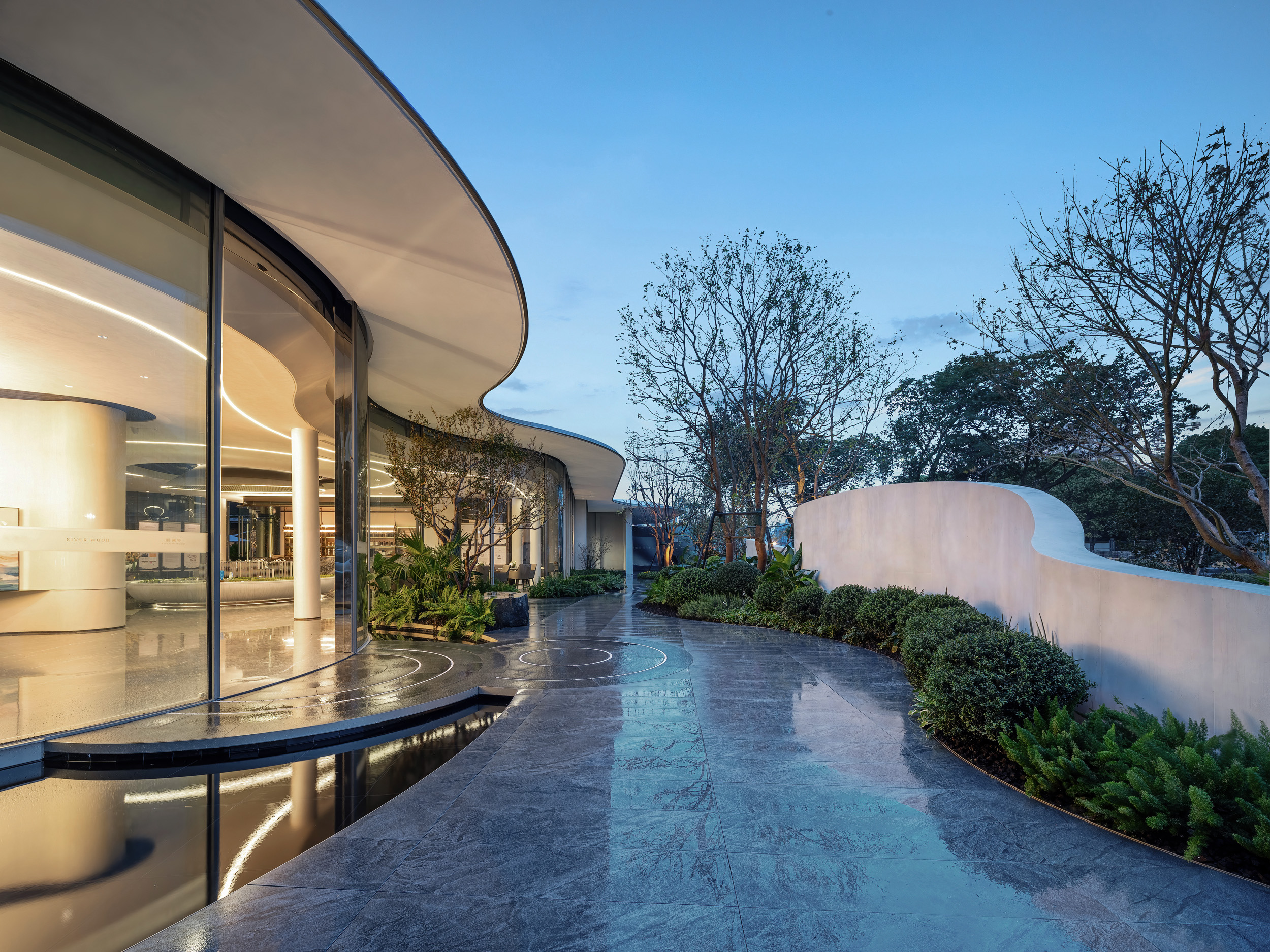 生活馆位于市中心的街角,周围绿树成荫,站在街角远望,弧形的建筑与场地完美结合。建筑本身造型简洁,用大面积的玻璃,白色艺术漆片墙与白色的飘檐营造出艺术馆般的风貌。置身其内,透过玻璃窗,可以看见绿树倒影,米白色的曲线屋檐,宛如流动的江澜一样生动自由,给这个街角带来了新的活力。远眺住宅,建筑比例优雅,虚实结合,整体呈现出简洁现代的整体效果。观其细部,线条精致,色彩上采用优雅的香槟金搭配细致的米白色层间线,勾勒出高级的艺术画框。