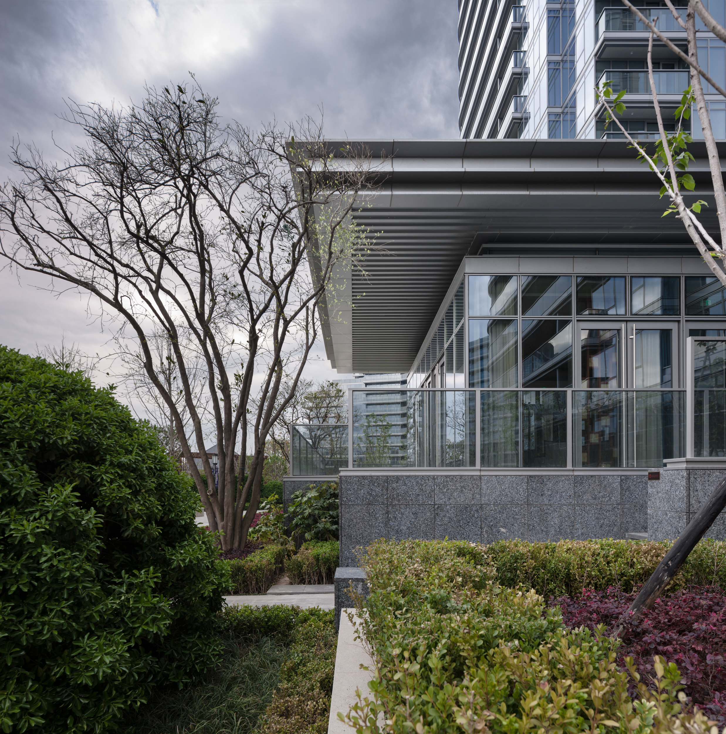 西侧住宅在平面上采用流线型处理方法,立面上错落有致,形成丰富的天际线,从而减弱对北侧现有住宅所产生的压迫感,并与南侧湖面与自然景观相契合。住宅南侧为开放式城市公园,公园步行流线的尽端是一至两层的商业建筑。商业建筑在平面上也采用一种合抱的形态,与蜿蜒的湖岸线相呼应,自然流畅。东区酒店紧邻主轴线一侧,与对面的住宅塔楼相对应,强化了中心轴线;与裙房相对的广场的一侧均采用两层高的廊柱,形成尺度宜人的灰空间,围合形成长方形的广场。住宅区与商业密不可分,塔楼采用两点两板四栋建筑,形成小区的围合空间和轴线关系,使小区入口位于东侧轴线上。东侧(二期)商业体量大于西侧(一期),相对而言更为完整。沿湖一侧立面分为三组,将大体量建筑化整为零,与湖面以及城市公园相融合。