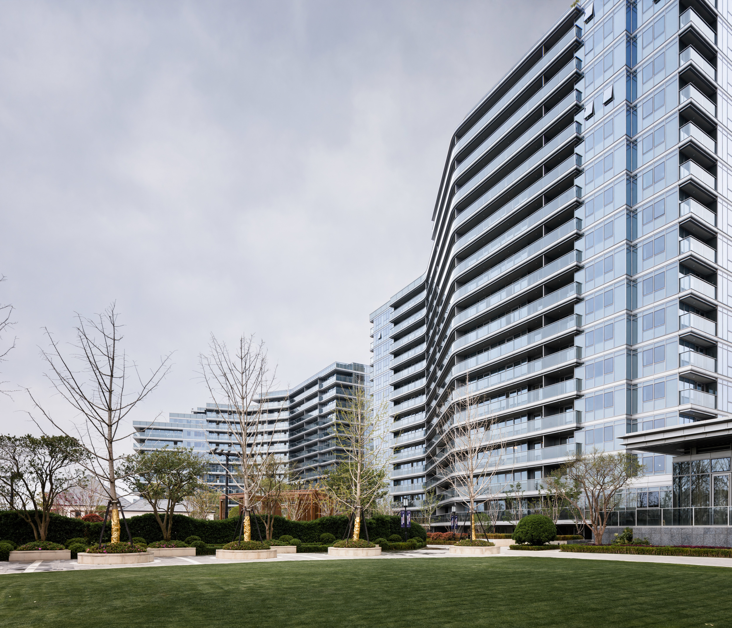二期住宅采用绿城二代高层的风格,塔楼采用两点两板四栋建筑,形成小区的围合空间和轴线关系,使小区入口位于东侧轴线上。东侧(二期)商业体量大于西侧(一期),相对而言更为完整。沿湖一侧立面分为三组,将大体量建筑化整为零,与湖面以及城市公园相融合。