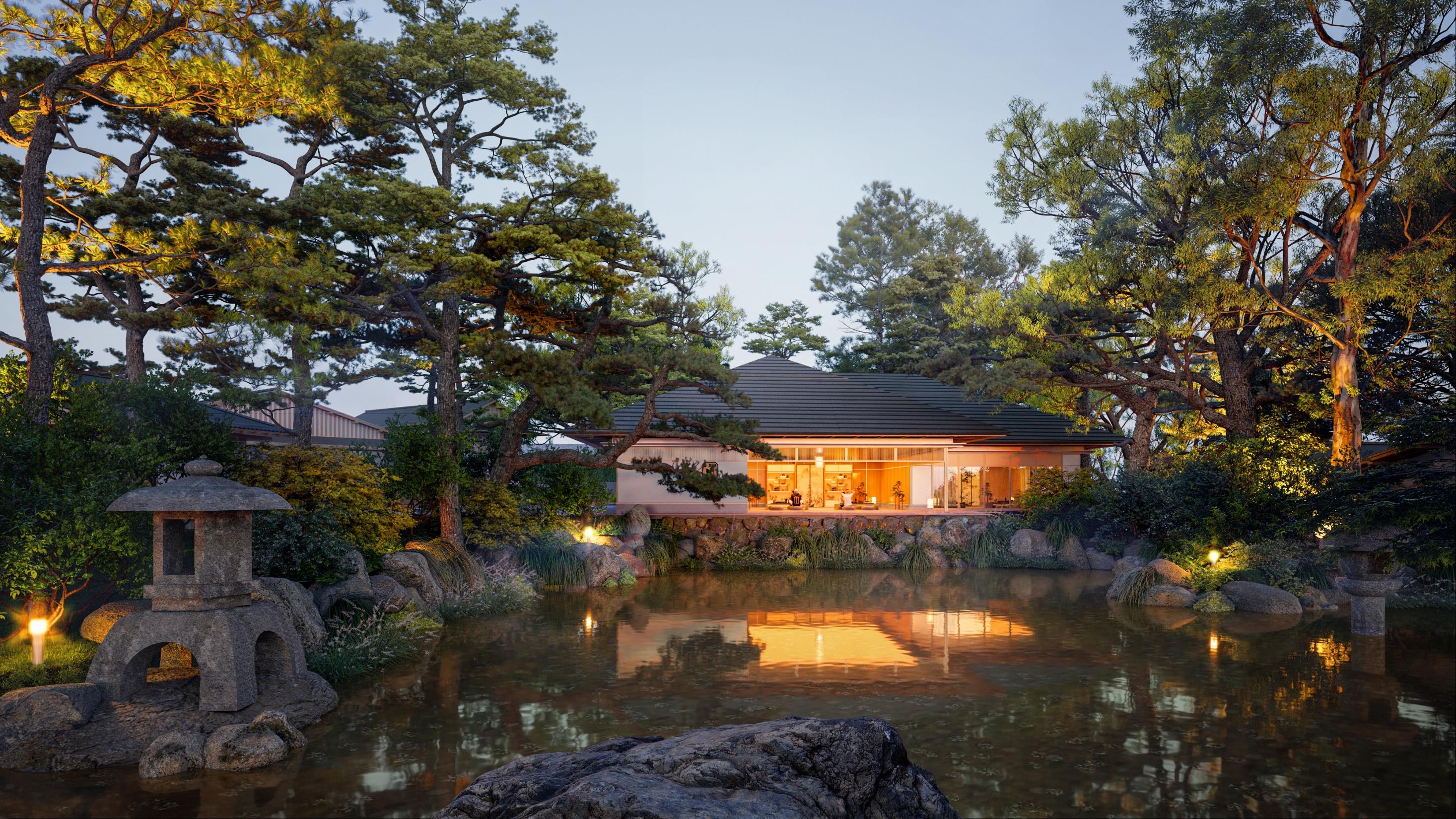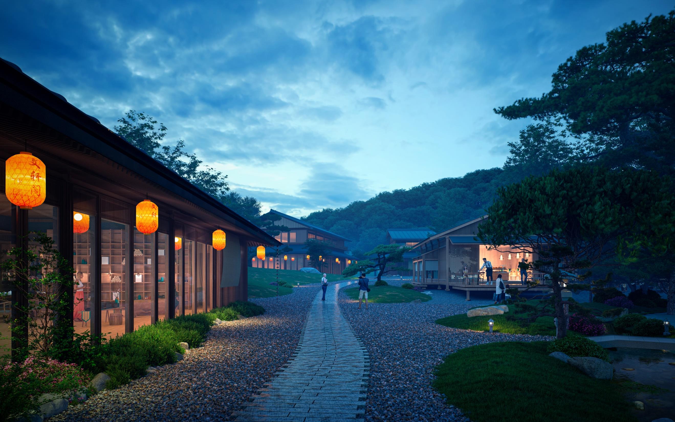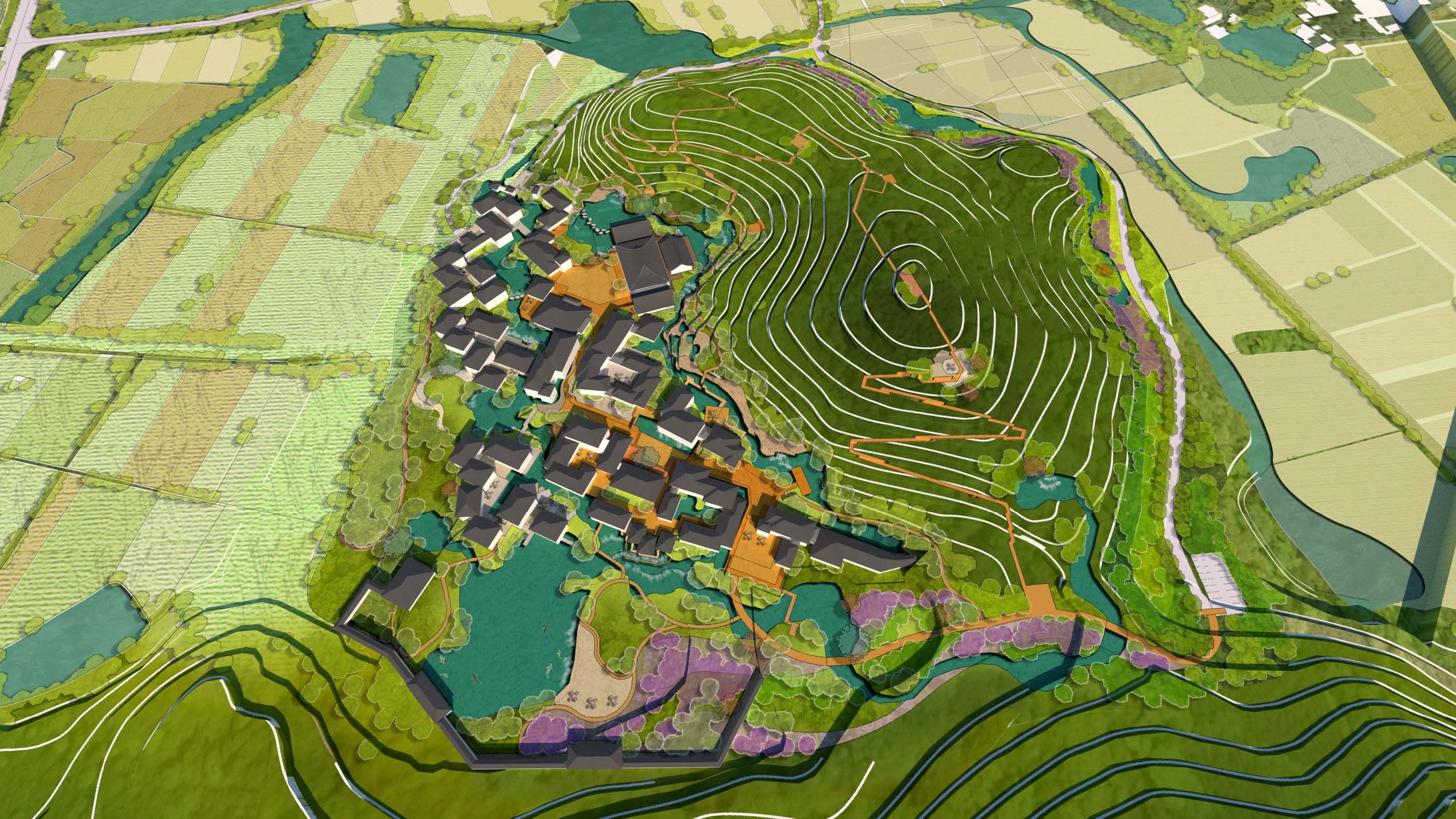 首启区承载项目美学示范、形象展示、接待中心等多样功能,设计结合场地山、水、村落的格局,以打造自然生长的村落空间为核心打造思路,充分尊重场地肌理,打造无想堂国医体验、疗愈民宿等多样功能,形成与自然融合、深度弘扬国医文化的国医文化体验。