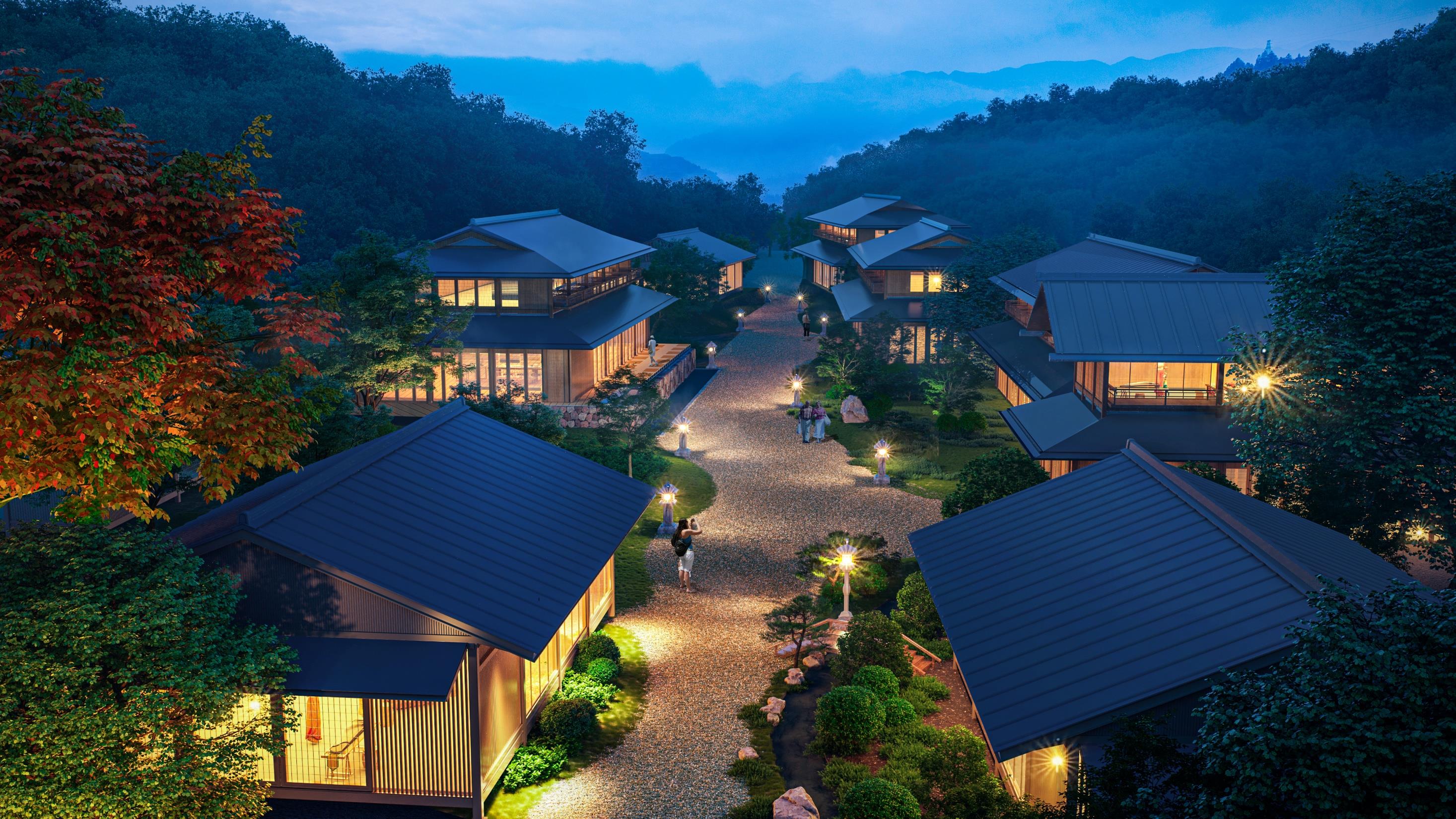 在空间设计上,吸取山地村落“若隐若现、若即若离”的空间感受,形成精致的拙朴的场景调性,与场地山水相融,东方禅意自然地流露而出,打造融天地于一色的体验。