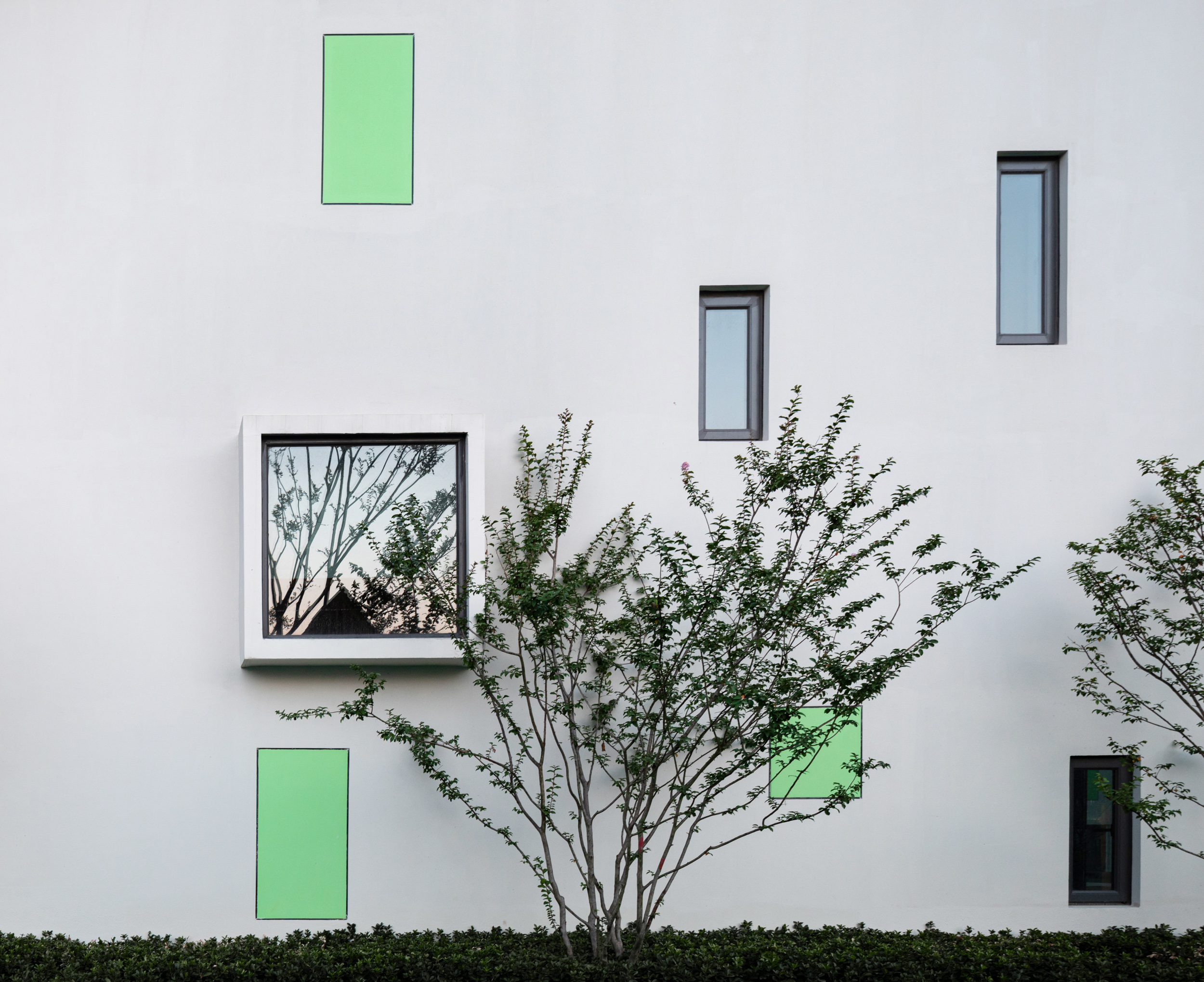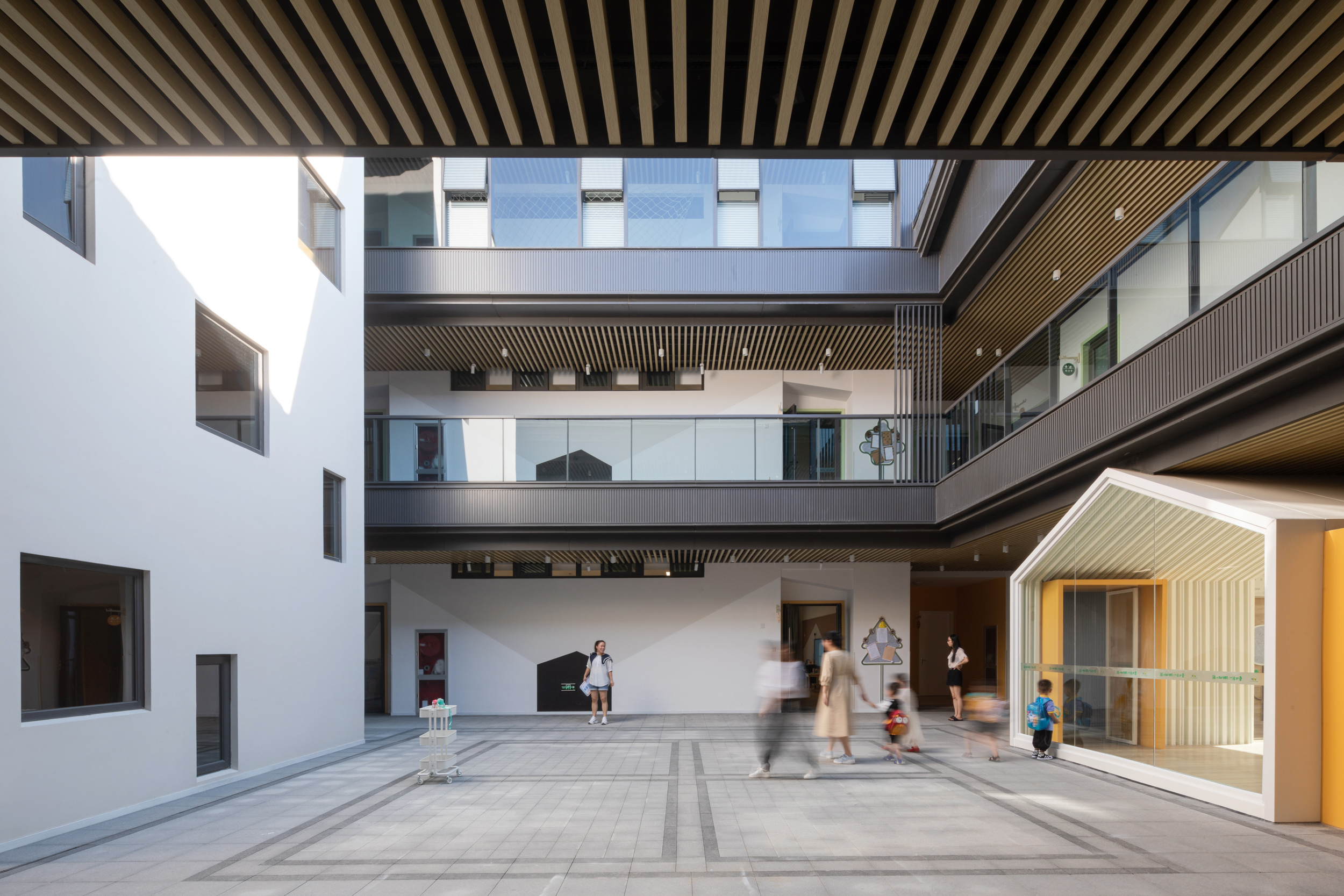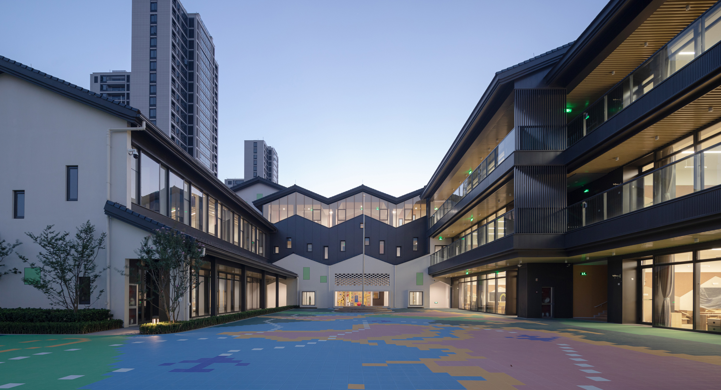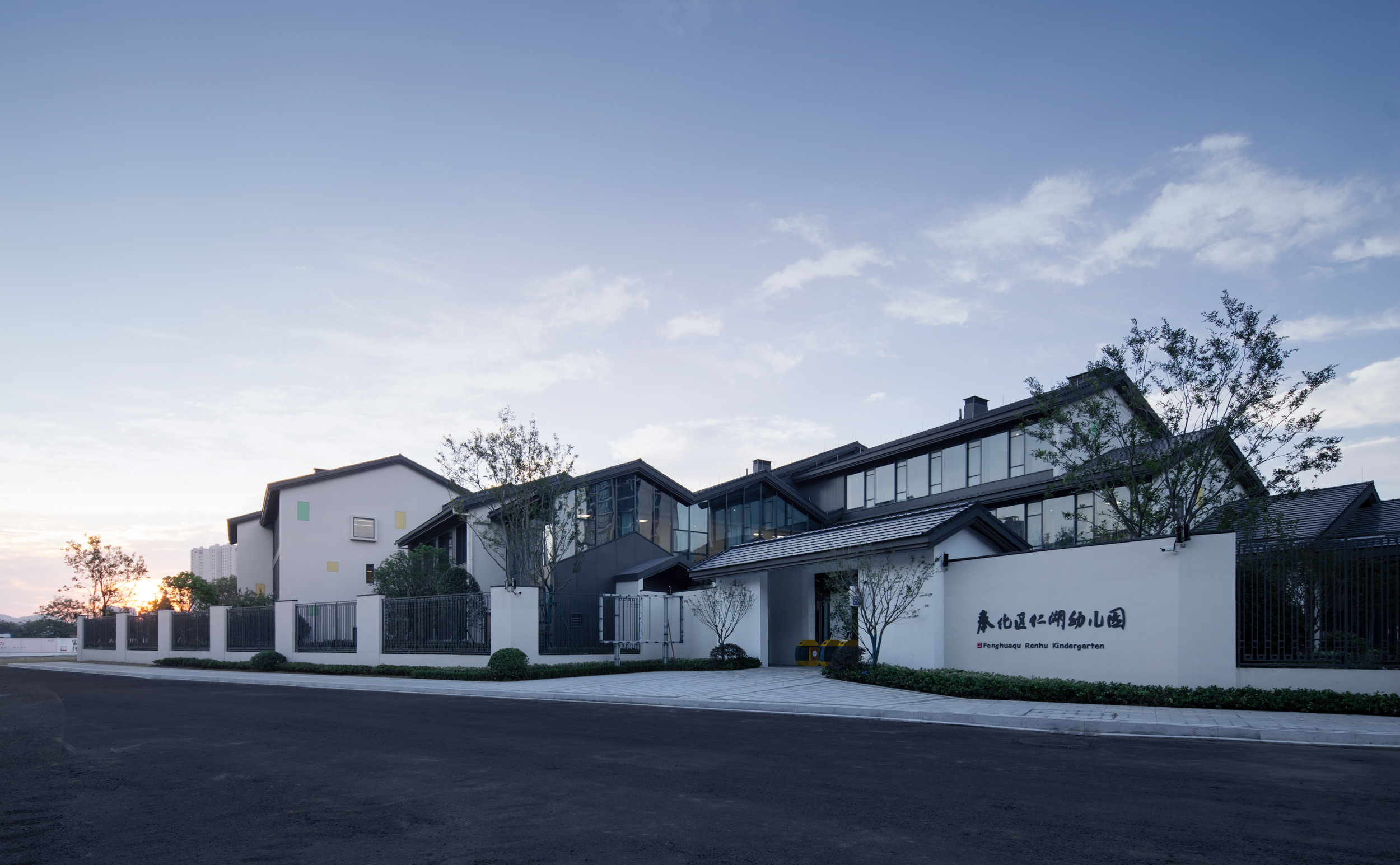 本项目位于浙江省宁波市奉化区,紧邻长汀云庐中式合院,结合周边中式建筑和自然丘陵背景,幼儿园采用了现代中式风格,建筑色彩以黑白灰为主,间或设置鲜艳的小型构筑体块和外墙色块,屋面线型呼应起伏的远山,让人想起吴冠中画中的江南,建筑设置了入口庭院,内院,外院等多重院落空间,亦是对江南民居多重院落空间的现代演绎。具有江南风韵的幼儿园让儿童在童年对故乡的风貌留有美好的记忆,记于心底并将伴随他们成长。