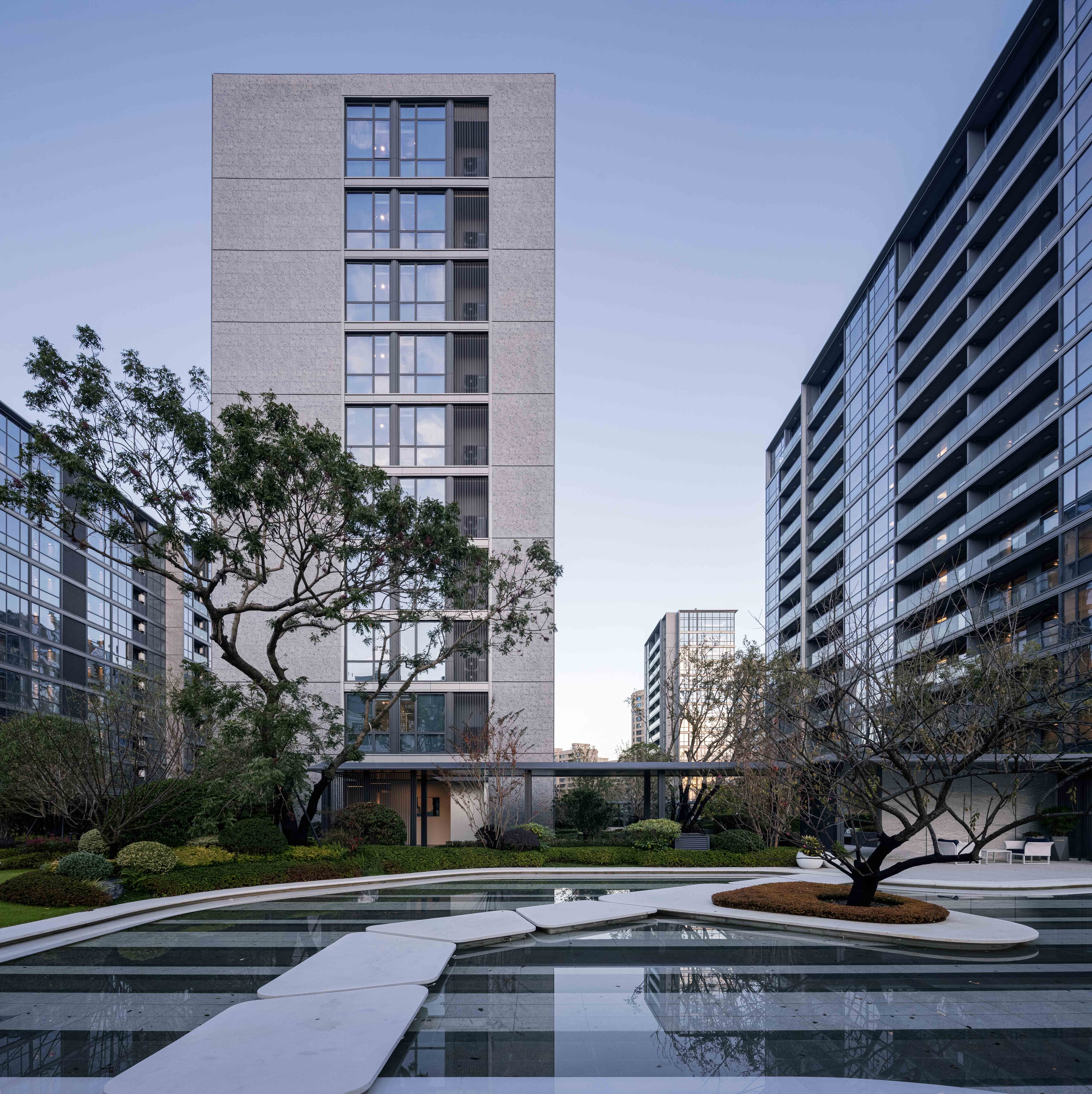 往项目东侧移步,楼幢之间围合出的组团庭院映入眼帘。体现私密性的水景在多层住宅与高层住宅之间形成半限定的状态,将风格有所出入的两个区域稍作区分,但并不完全割离,整体通过丰富的路径形成联系。