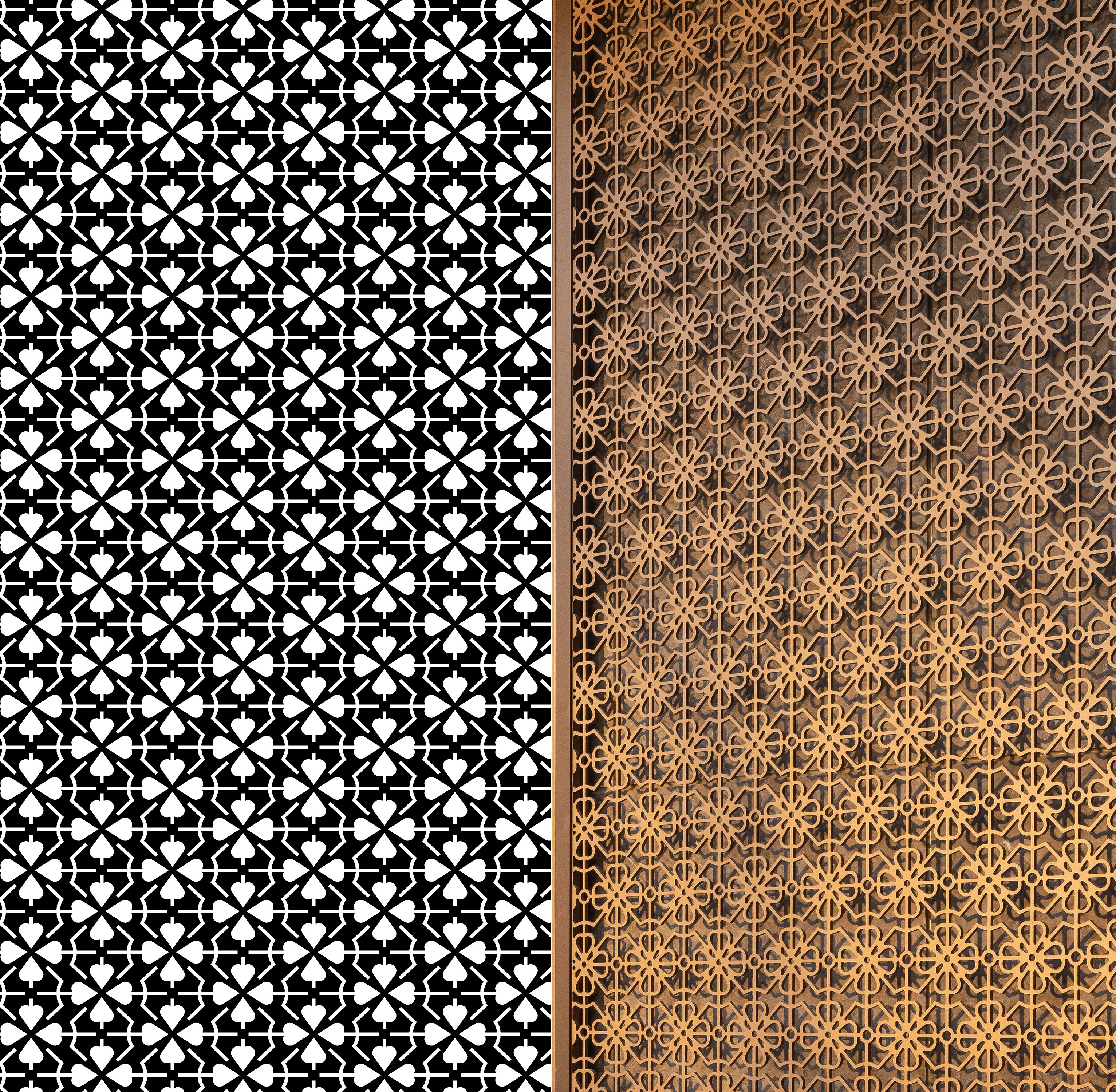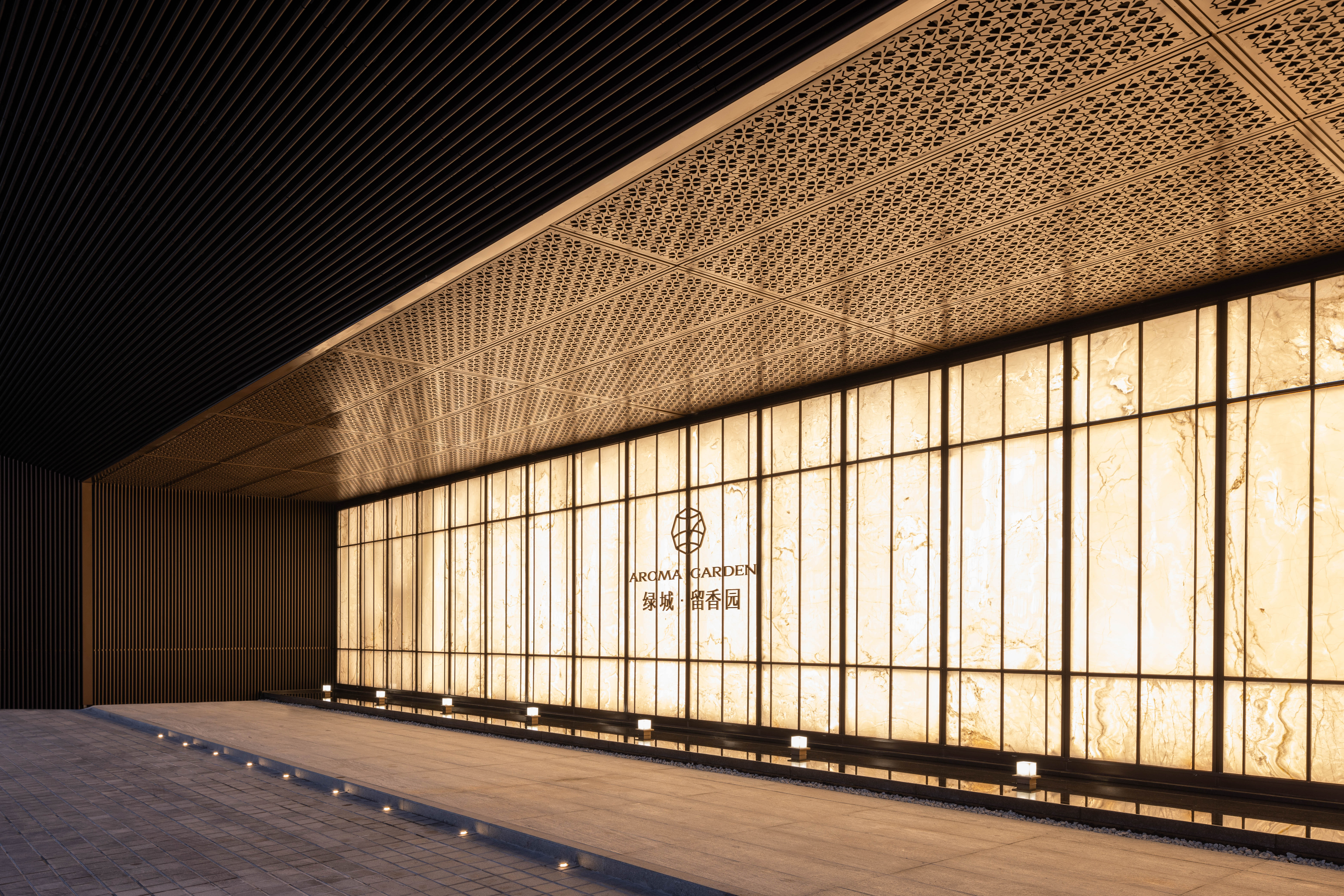 精致的细节,典雅的用色,将东方美学和古典比例融合,是对于上海海派独特韵味形意的转译。云石与阴刻铝板的有机组合,镂空装饰金属网与落地无柱玻璃幕墙所营造的半透明感,旨在通过不同材质的交接和处理以及对细节和触感的把控,拉近使用者和建筑之间的距离,形成更加亲人、温暖的归家氛围。