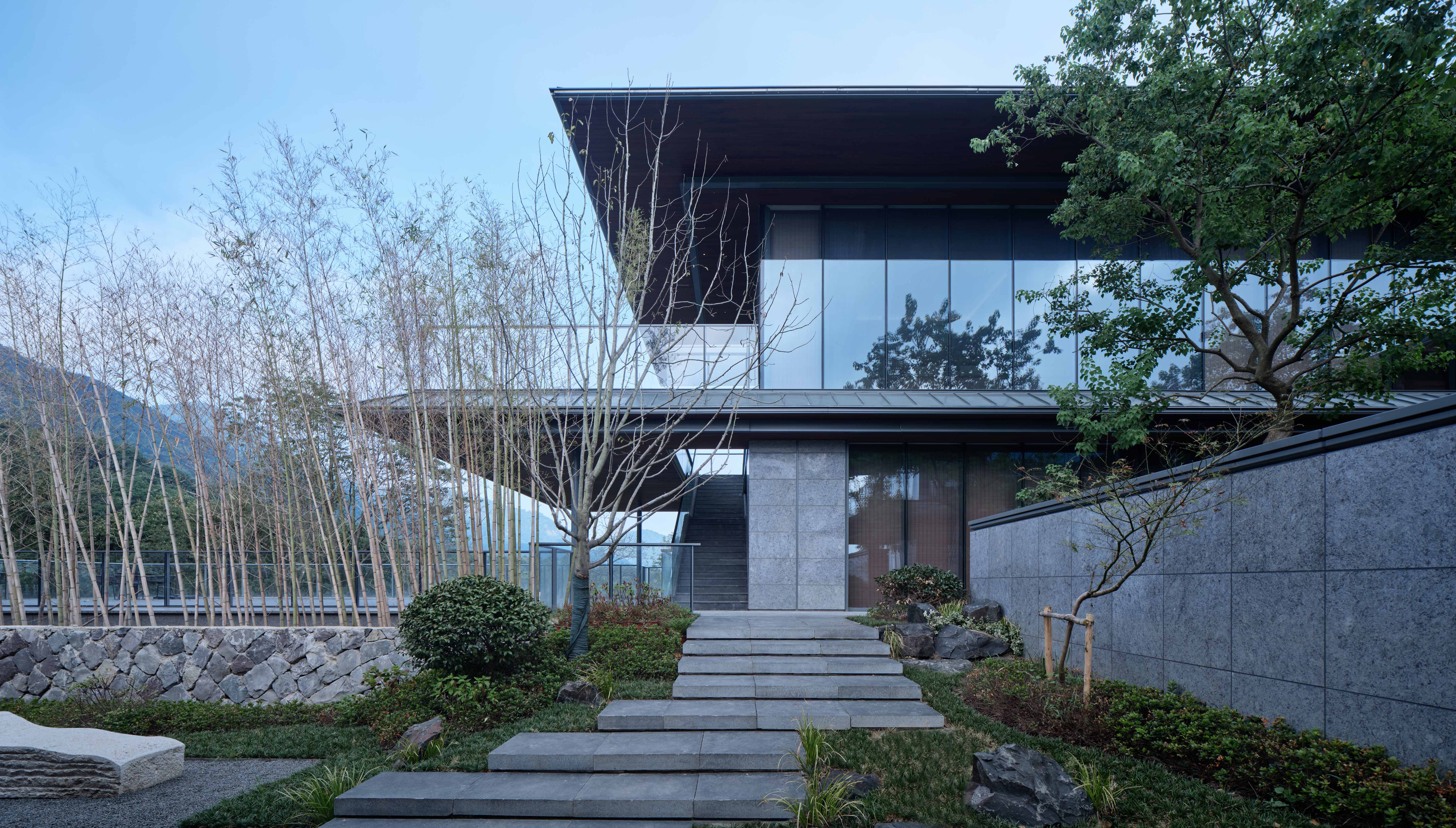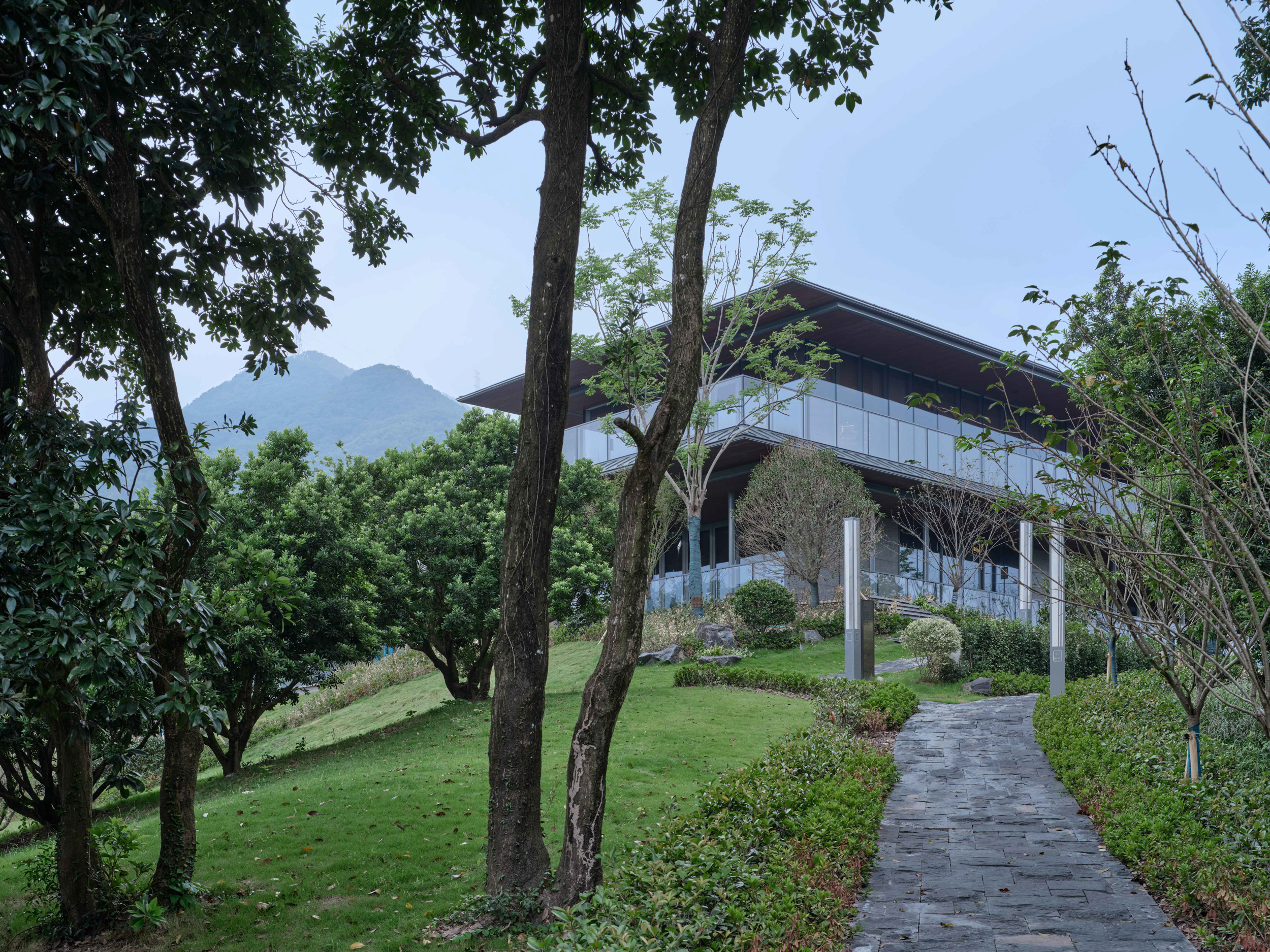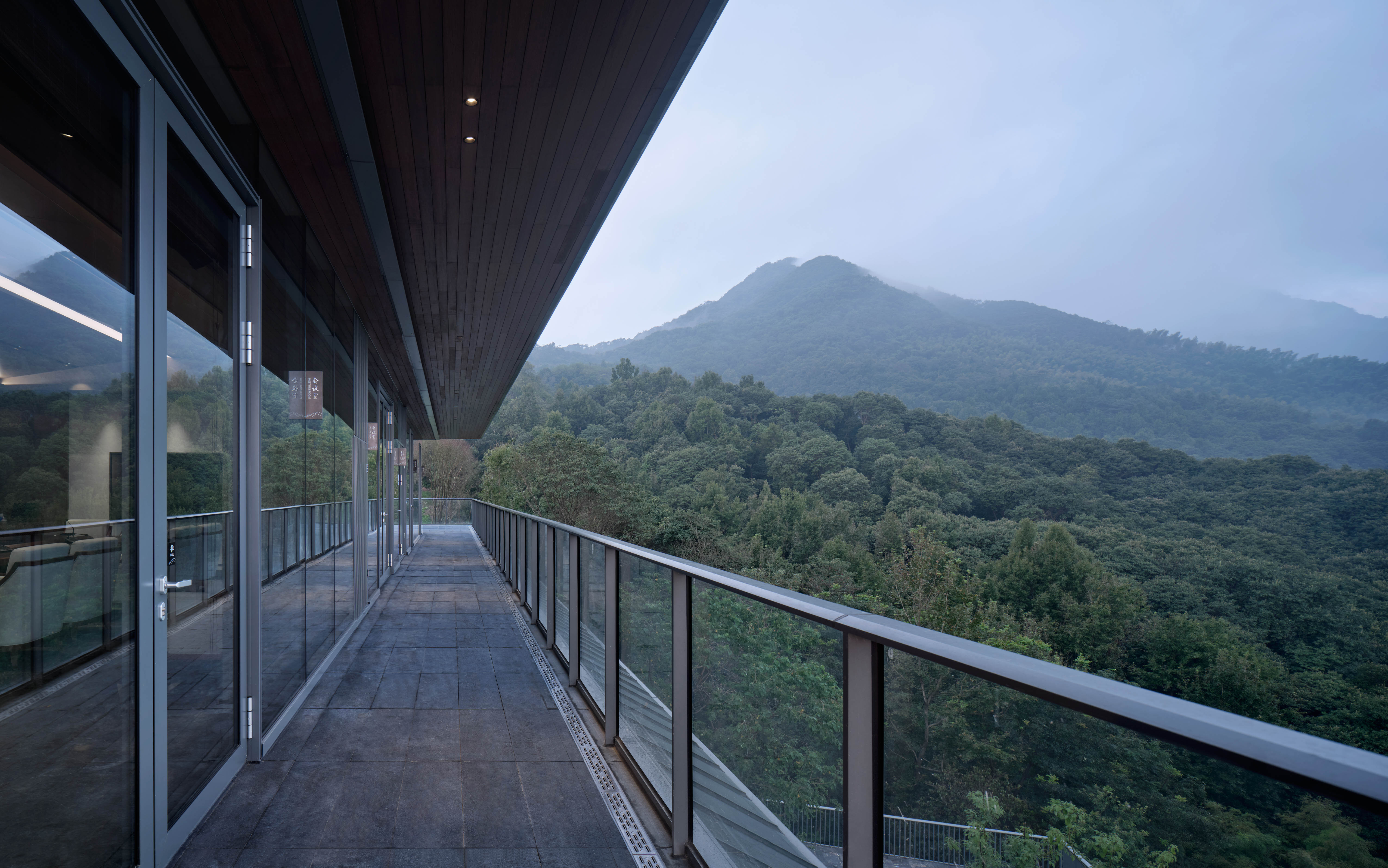 公共区坐落于位于大同山侧、小山头平地上,周围的原始树木郁郁葱葱,透着幽静浓郁山林气息。将建筑设计为两层,透过窗户刚好能看到树冠的舒展之美,转身踱步间就能越过树冠看见远山。大面积挑廊和大量的落地玻璃窗模糊室内外边界,仰首观望树林,俯听窸窣虫鸣,设计的主题,便在这大自然之间。