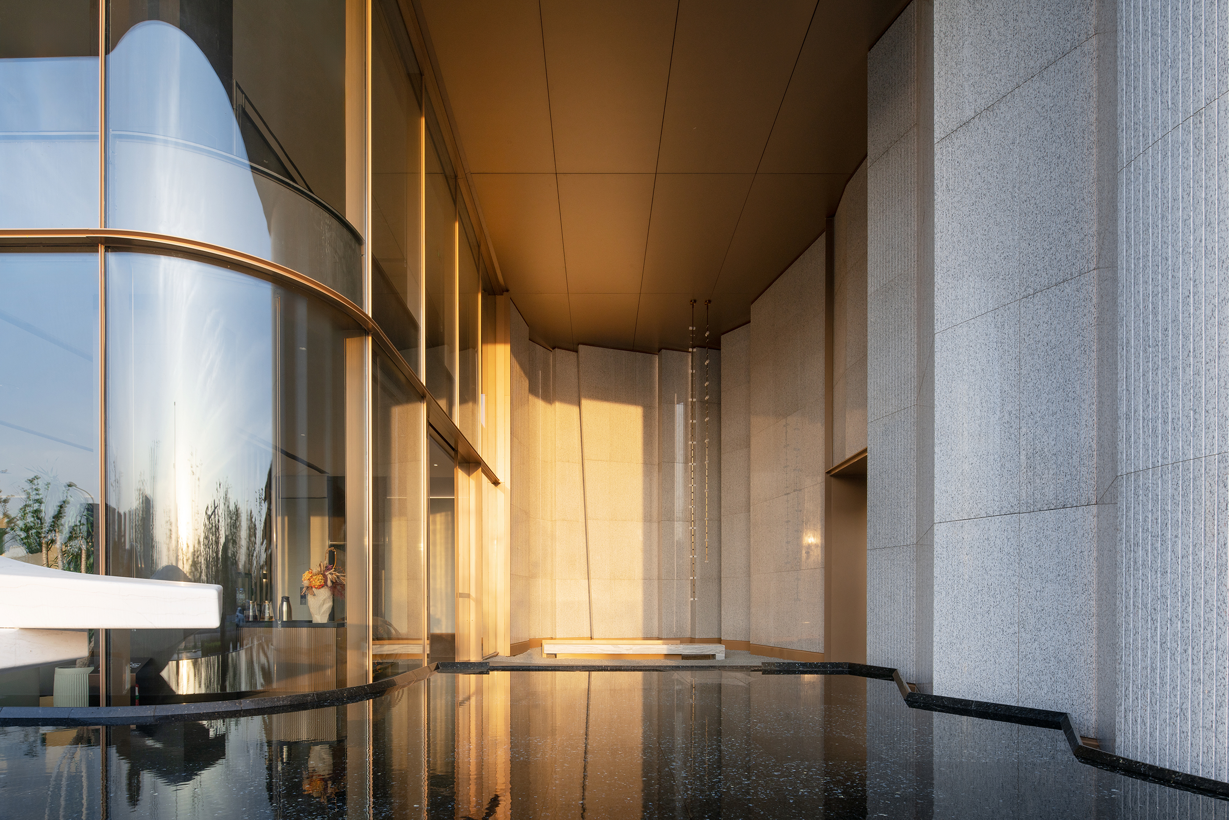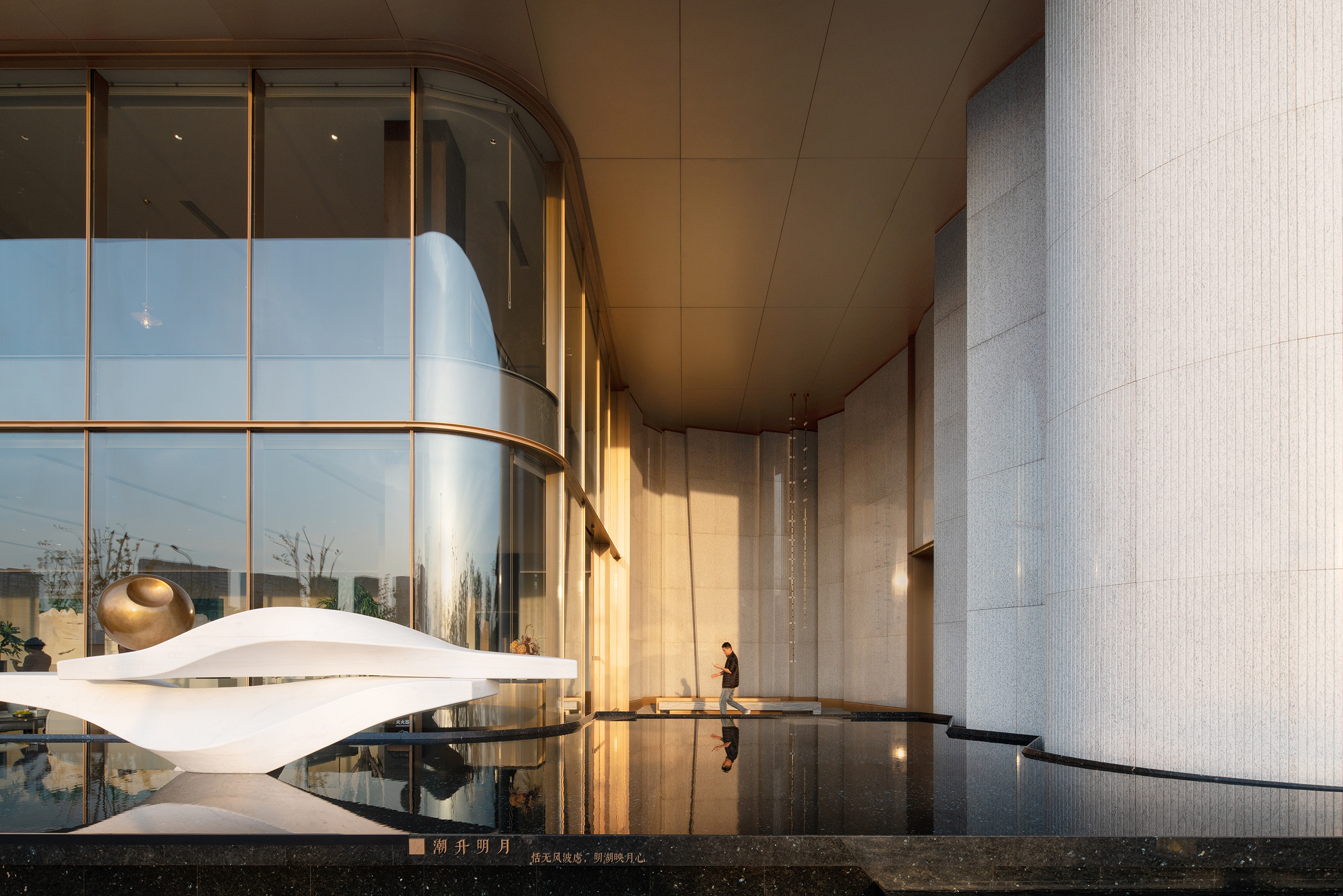 简单干净的线条勾勒出大开大合的空间形态,浅色石材搭配金色金属线条,没有过多的装饰,却在走近的时候能够感受到细微之处的考究:小巧的线脚、细细刻画的石材拉槽肌理、从凹缝透露出来的柔柔泛光。华灯初上,褪去所有不必要的繁瑣,让人们回归空间本身。
