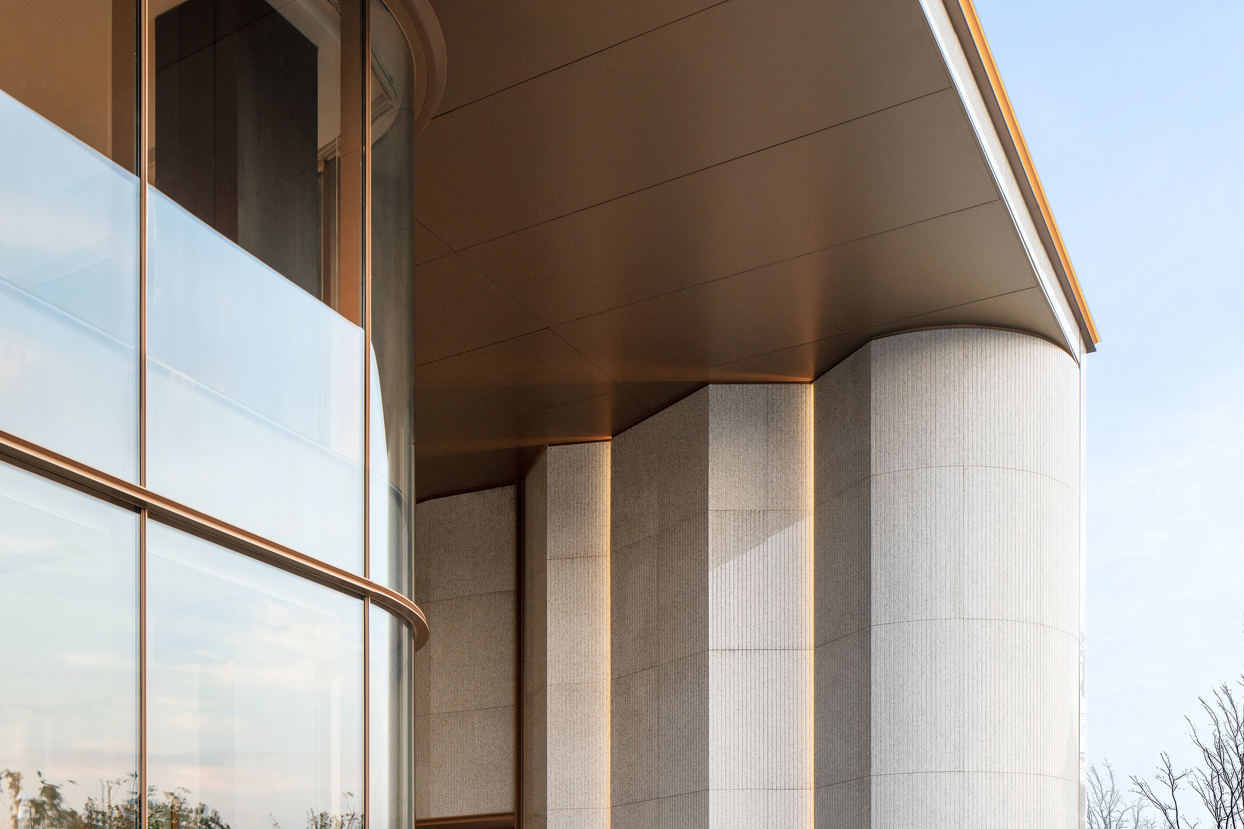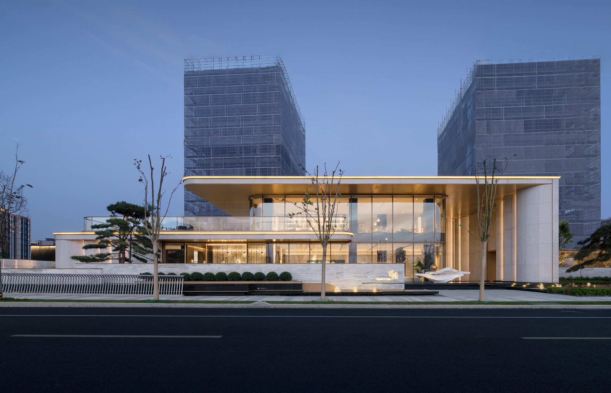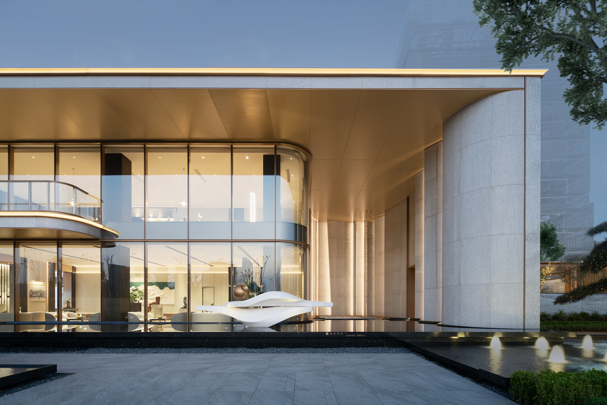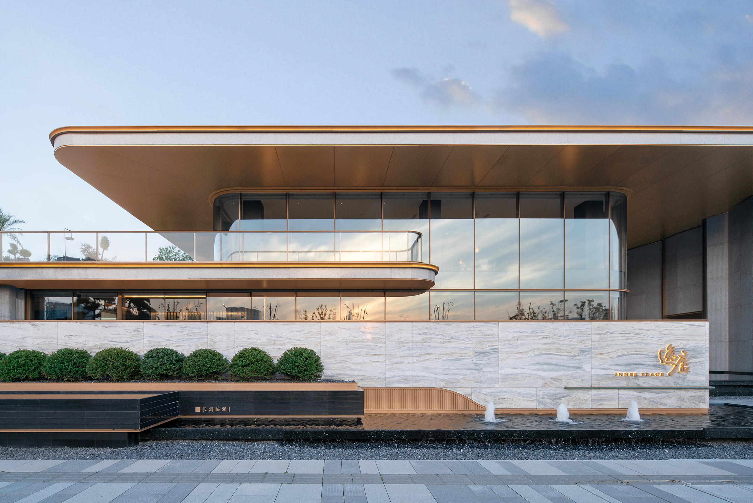 项目位于宁波明湖之畔,坐拥一线湖景,与明湖公园水系景观共同勾勒出一线湖景大宅。弧形转角造型,温和建筑体量,呈现温润典雅的建筑气质。大面积落地玻璃,270°环幕曲面屏,打造无界宽幕立面,极致视野。机翼式弧形外挑铝板,轻盈建筑体量,同时起到遮阳功能,降低能耗。取中国古典金镶玉的韵味,融于建筑白+金的组合之中,精致搭配,延续经典。