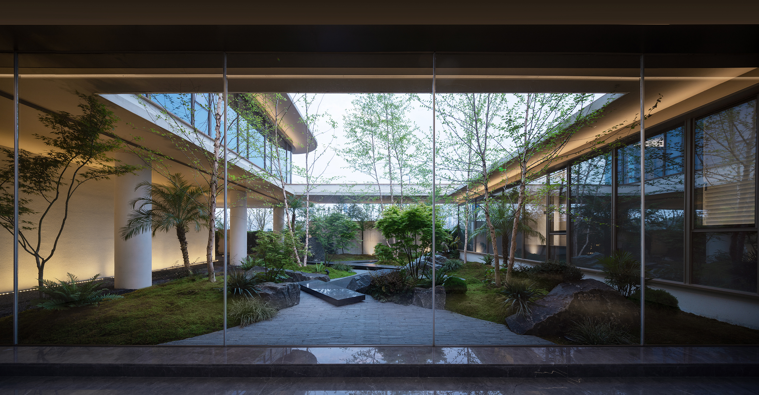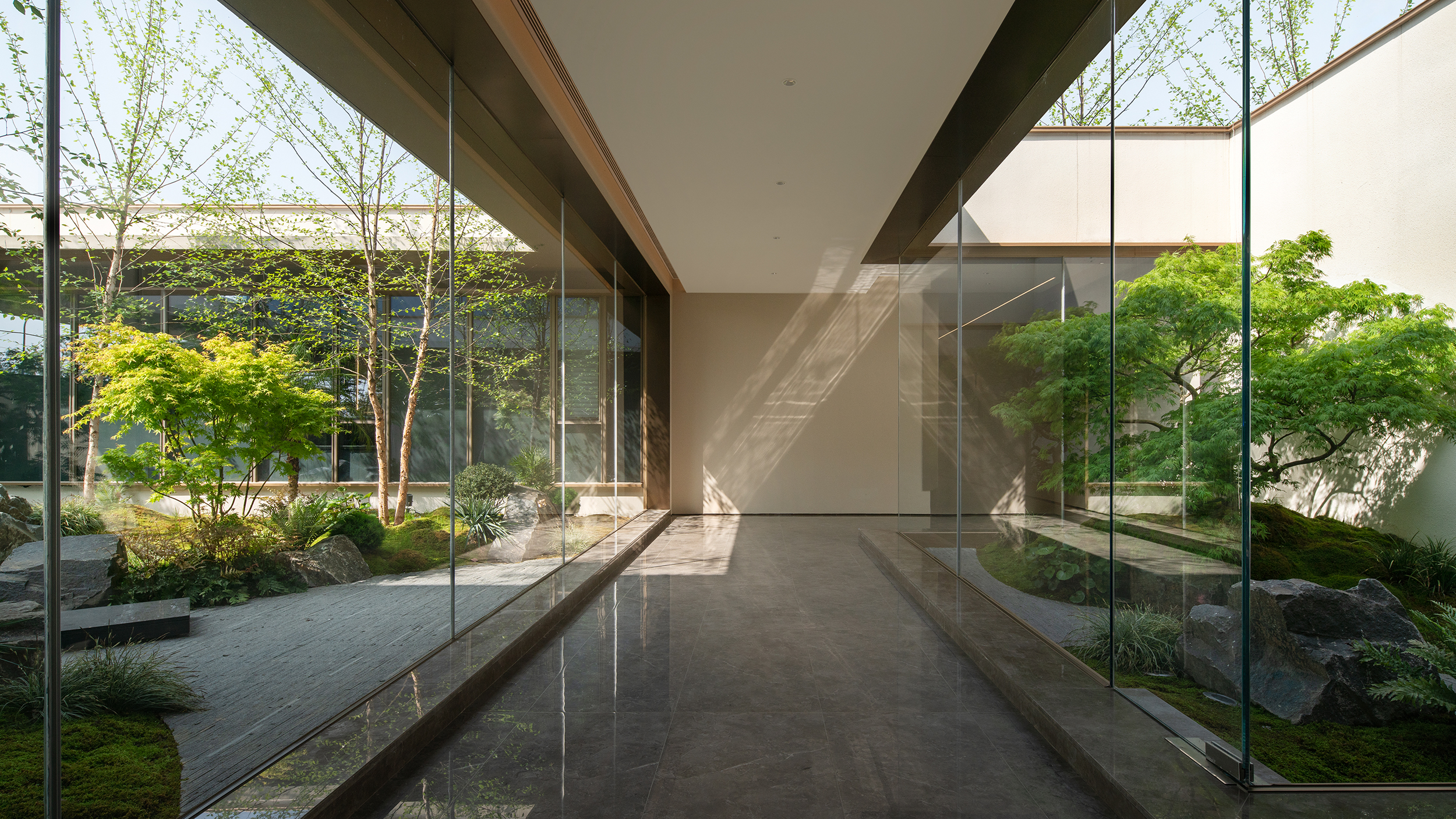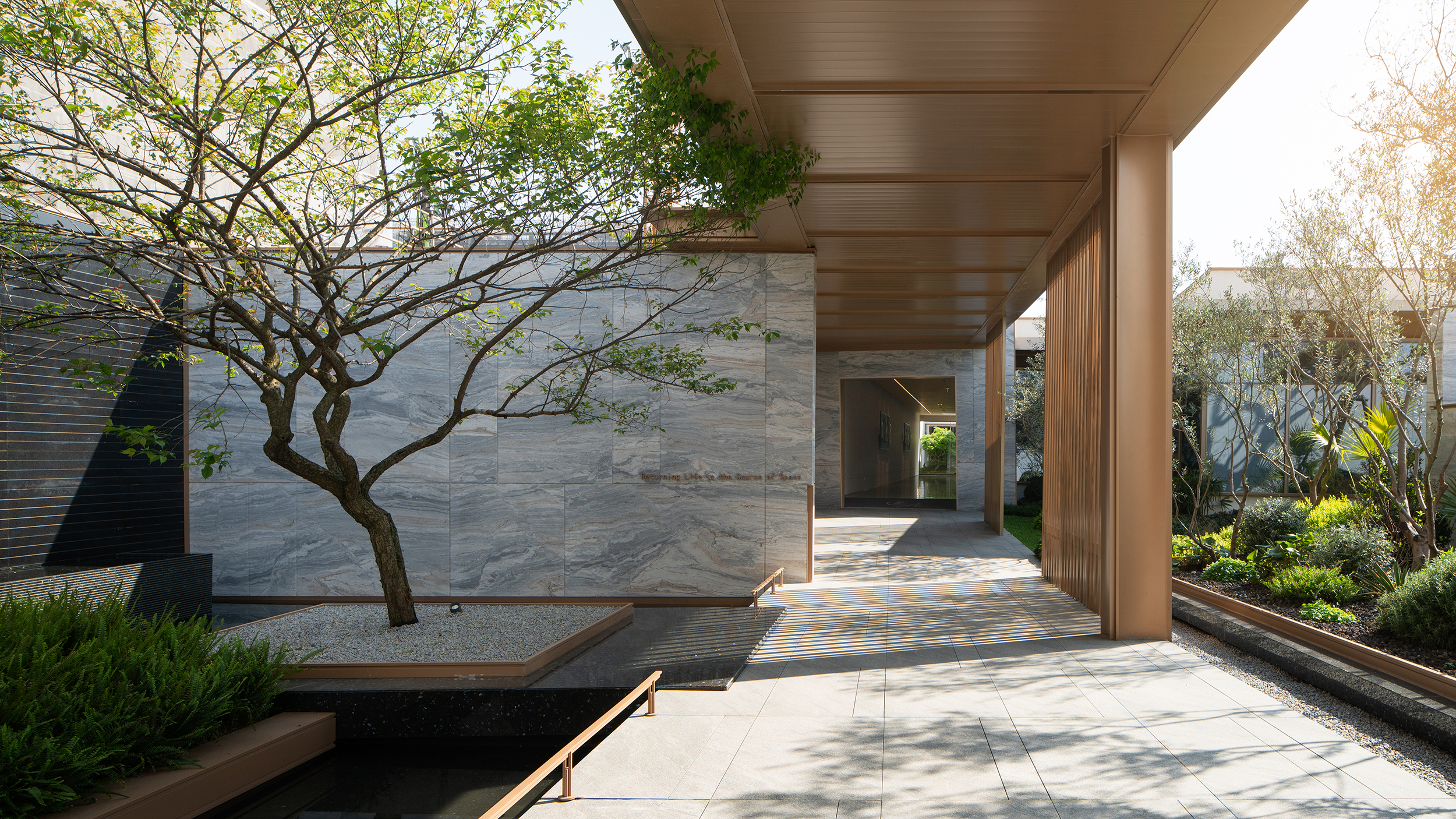 串联精神空间的是被模糊了边界的自然之景,伸入连廊的树枝随风摇曳,光影在半遮半掩间,有了层次。穿梭在游廊中,移步异景。此时,建筑不是孤立的个体。