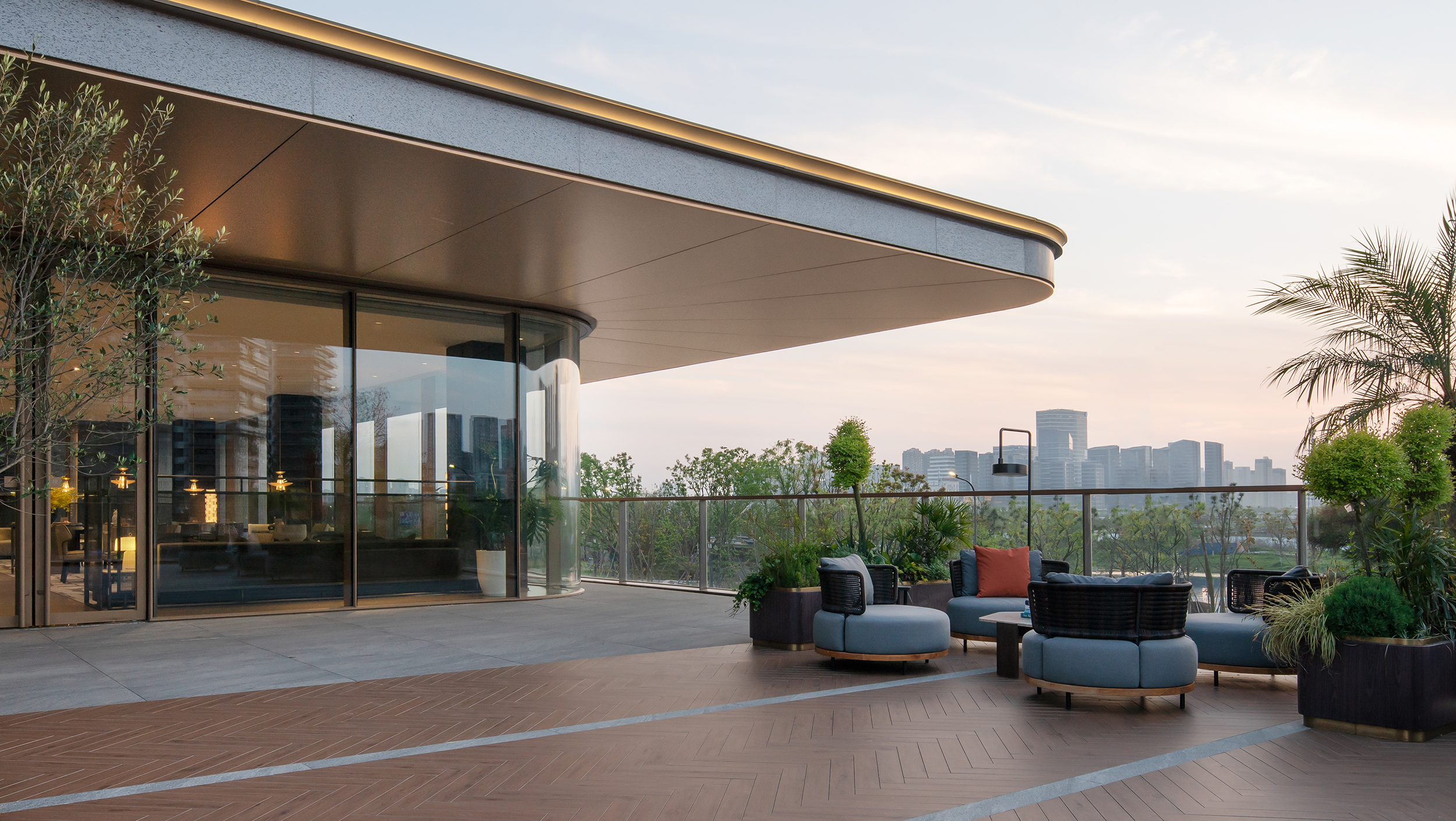 凭栏二层,明湖之景尽收眼底,宁波中心遥相呼应,在夕阳的照耀下,城市天际线变成剪影。在露台上边欣赏晚霞,边享受晚风,坐等华灯初上,颇有种大隐隐于市的感觉。
