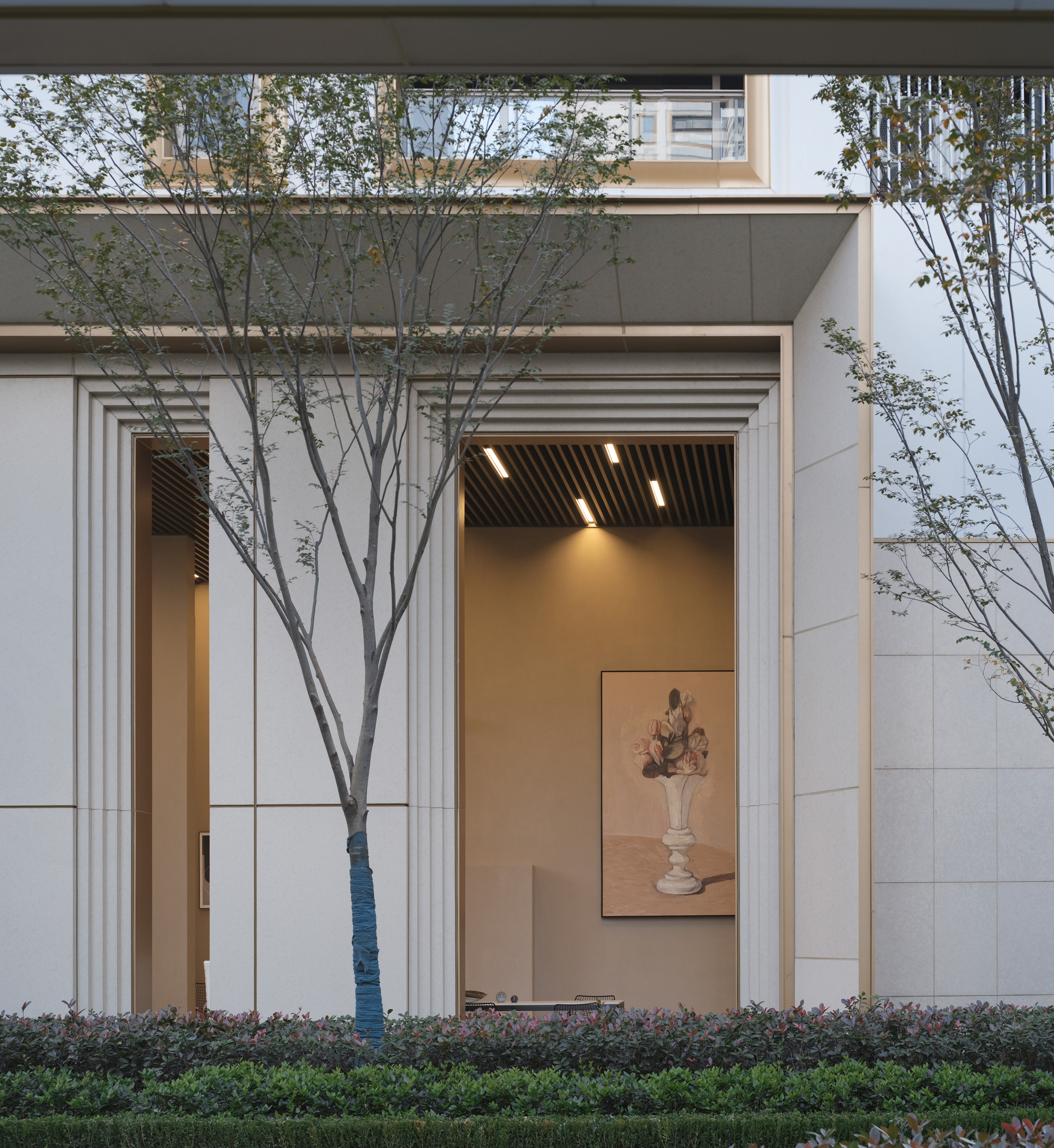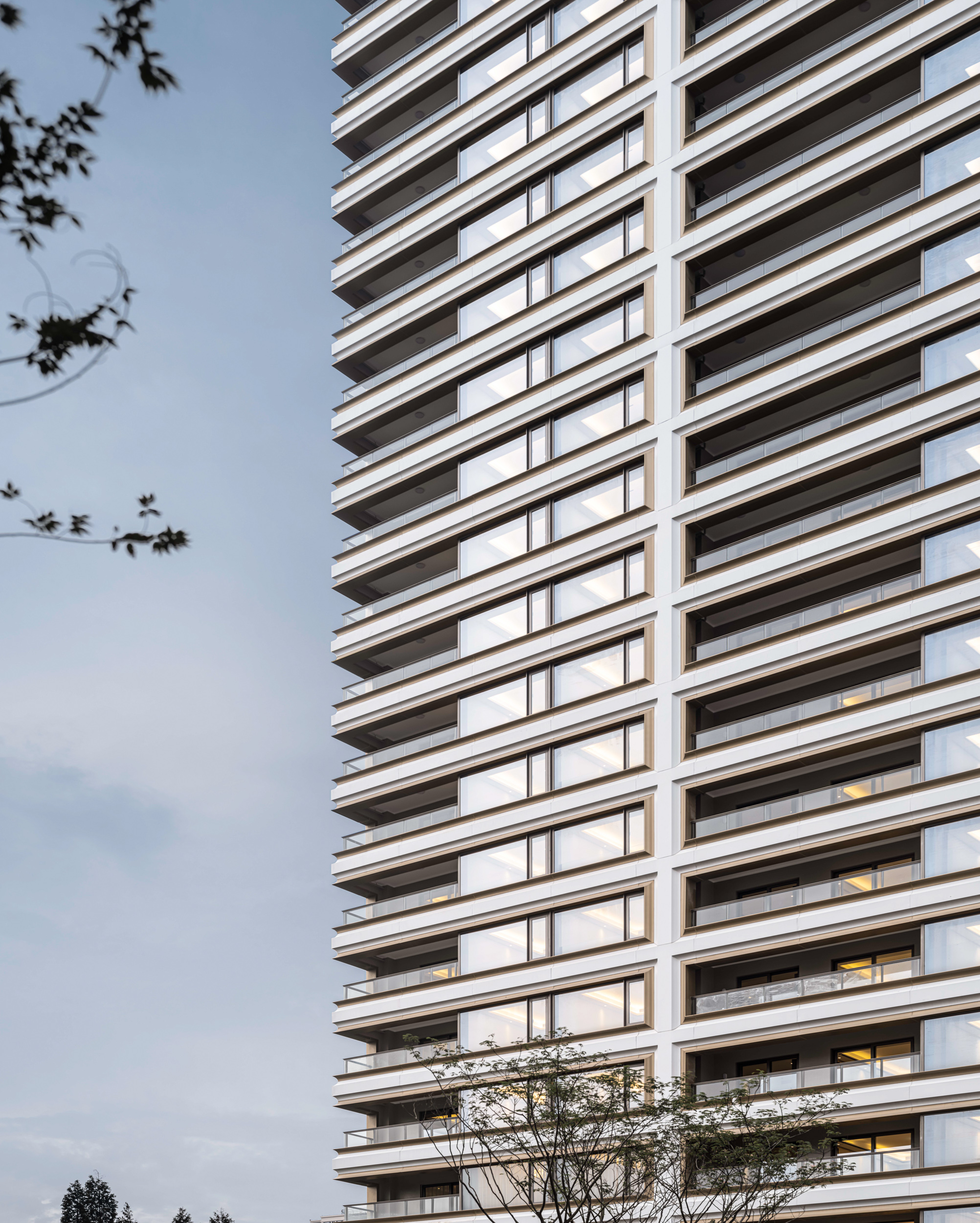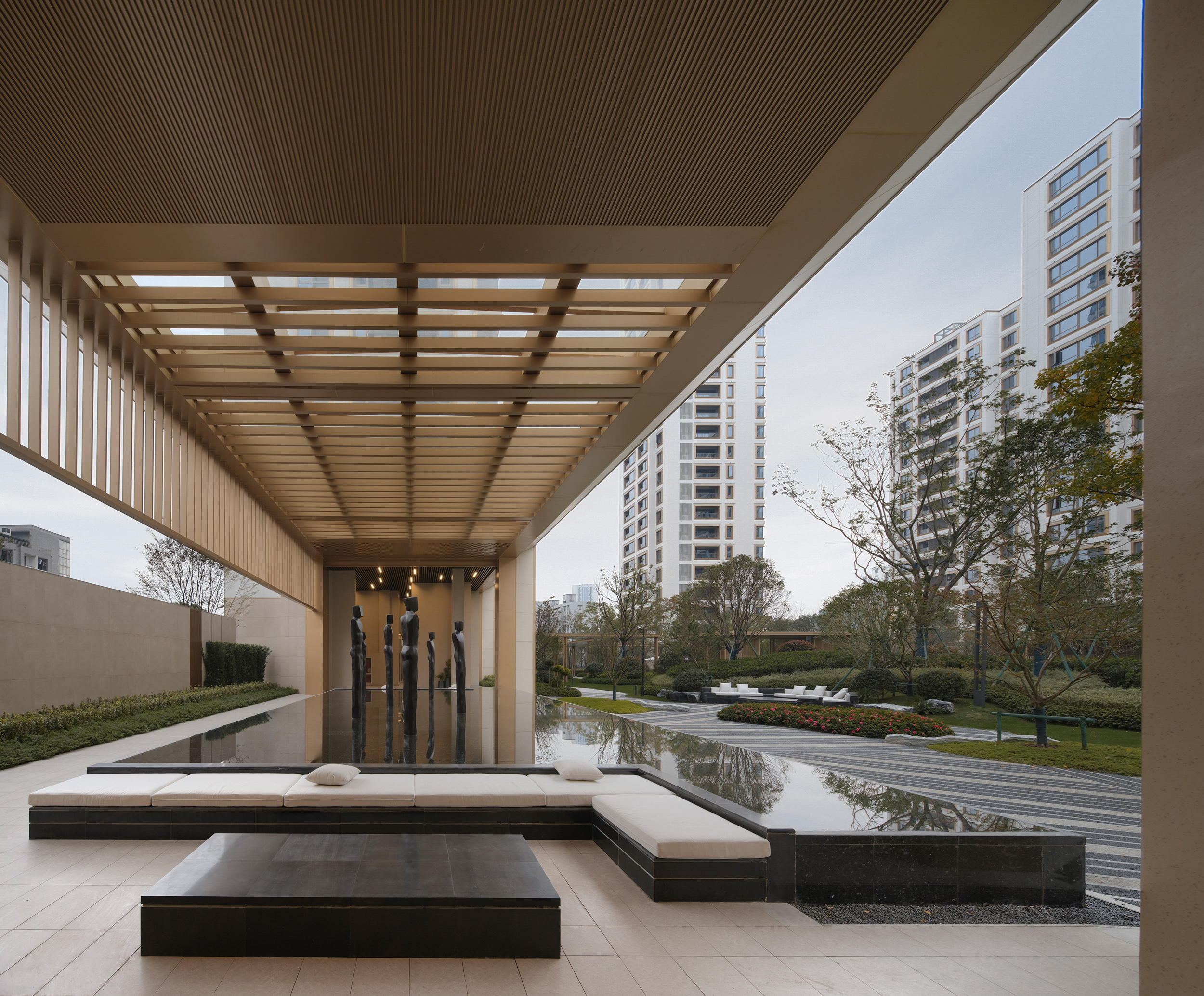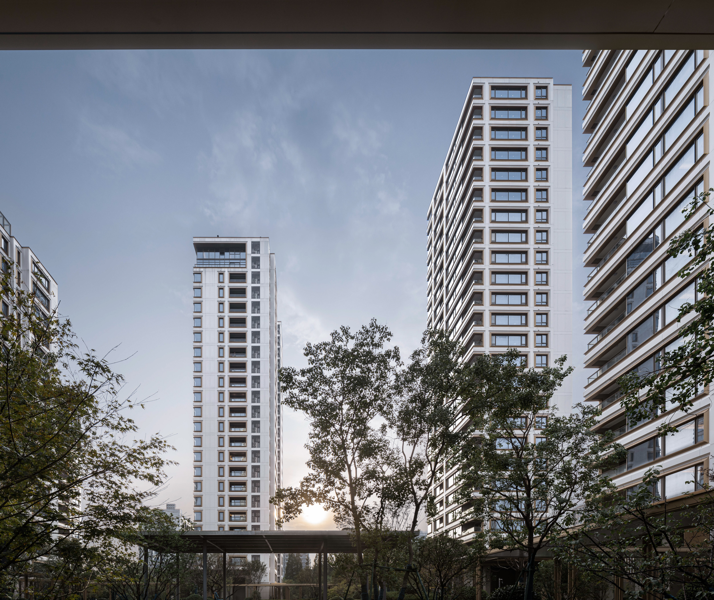 项目的住宅设计将区域内的整个城市界面纳入考量,以白色和金色的组合,而不是冷色作为立面主要色彩,以出众的色彩为千篇一律的建筑泛滥的城市增加了温度,丰富城市的建筑形态以及公共界面。建筑的细节将“斗拱”、“天井”等传统中国建筑元素纳入,用更加简洁的现代建筑语言进行表达;材料则延续了该区域的工业建筑传统:底座由一系列深深的凹槽相互交错;特别定制的弧形玻璃被利用在每一户的窗户及转角,为居住者创造更高质量的采光以及通风条件。高层住宅围合成一个中心庭园,形成由南向北的“主入口——中心庭园——住宅”依次的序列空间,以现代建筑形态演绎传统东方空间逻辑。由主入口开始延伸的风雨连廊串联了各个组团庭院以及楼幢,使园区内空间丰富而联系紧密。