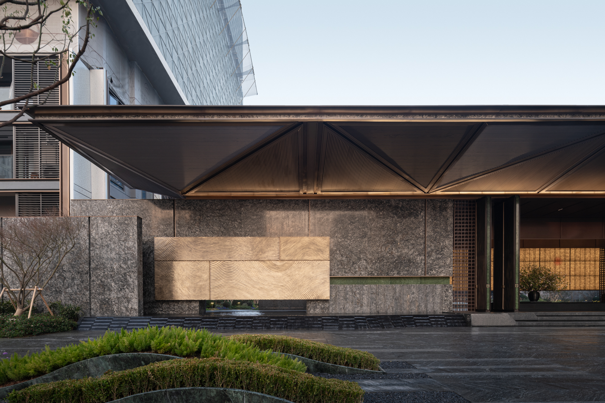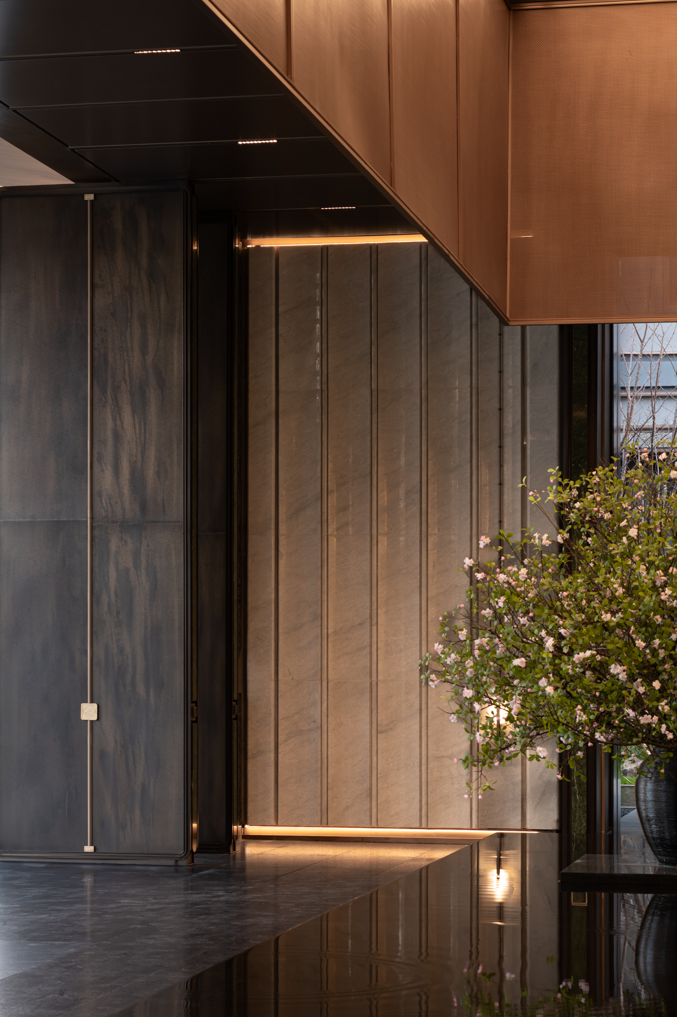 入口空间以参数化设计重新诠释江南风韵——定制铜板通过数字化算法生成流动的肌理,或似水波潋滟,或如山影层叠,在光影下泛起微妙涟漪。铜质的温润与铂金钻石材的冷冽光泽交相辉映,前者承载千年文脉的厚重,后者勾勒现代美学的锋芒,碰撞出“刚柔并济”的视觉张力。铜板表面经鎏金氧化处理,呈现深浅不一的古金色调,与铂金钻石材的璀璨星芒交织,仿佛将江南烟雨与星河夜幕同时镌刻于归家序章。