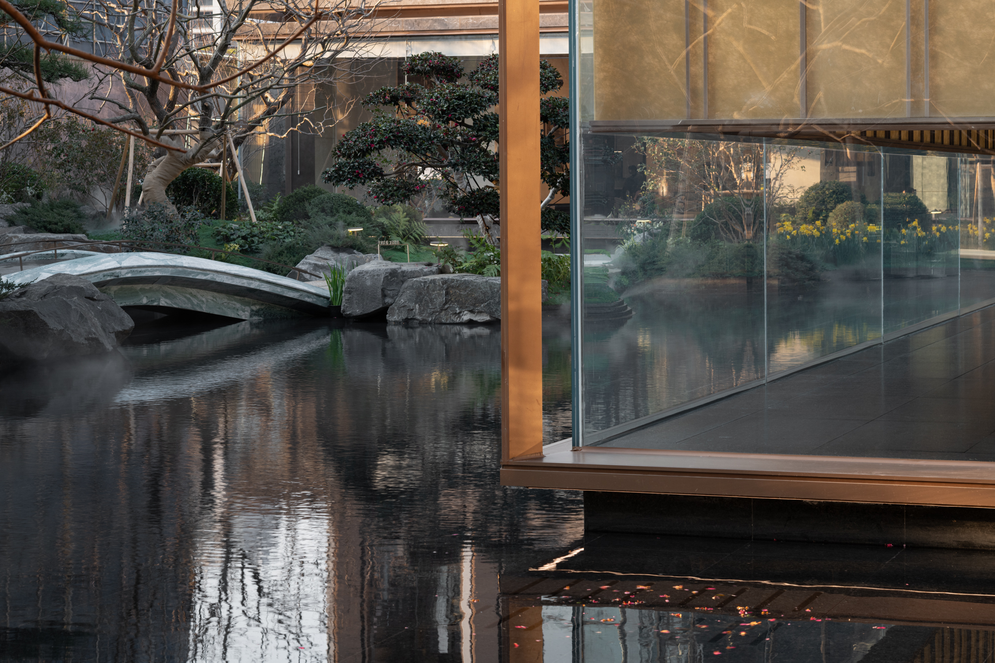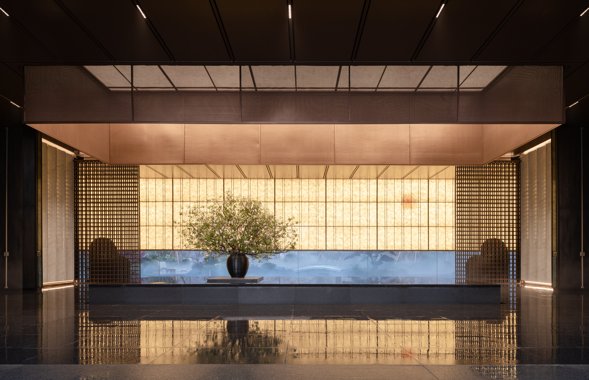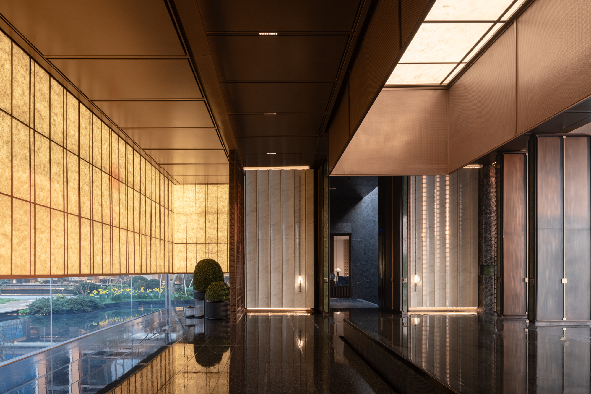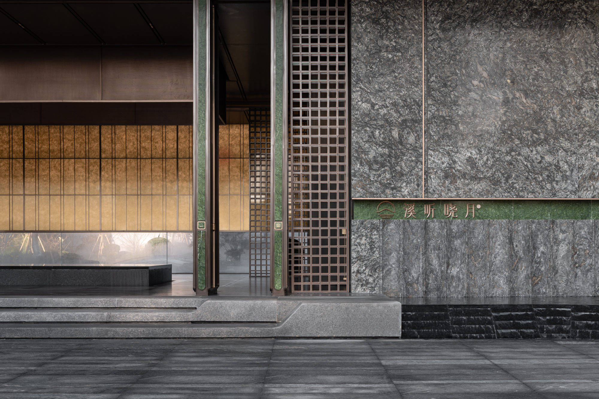 设计师以当代手法解构传统屏风的虚实关系,将建筑与自然光影交织。木纹屏风的布局暗藏东方礼序:入口前场以开放式姿态迎接宾客,屏风横向延展,形成半围合的过渡空间,既保持与城市街景的互动,又赋予归者心理上的庇护感。前景木纹雕刻屏风为核心叙事,保持了纵向的序列感觉。背景透光玻璃结合云丝板如“折叠屏风”般层层展开,在光影下形成虚实交错的韵律,既呼应江南群山的层峦意境,让空间在开合间演绎东方美学的留白与韵律。